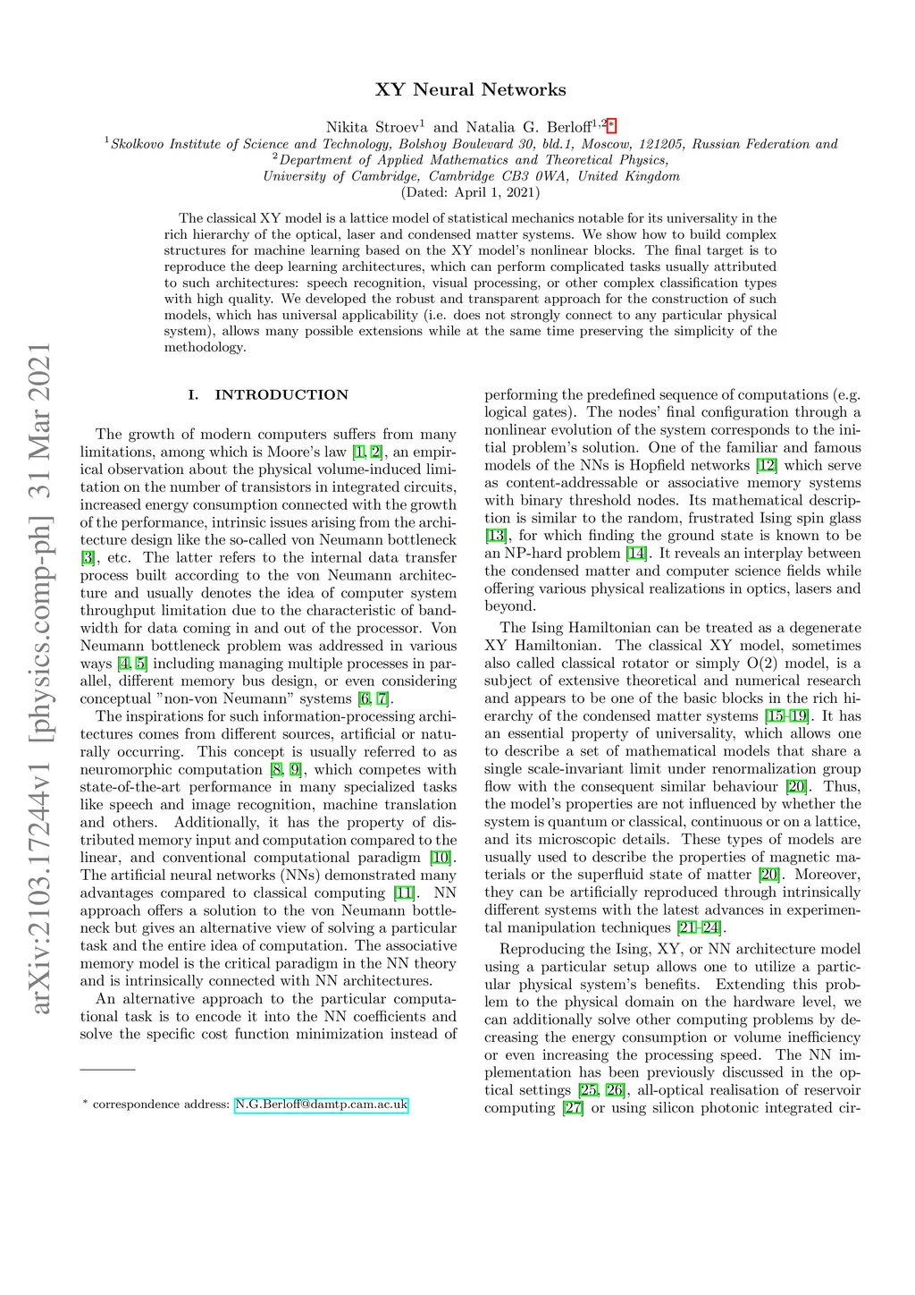 The classical XY model is a lattice model of statistical mechanics notable for its universality in the rich hierarchy of the optical, laser and condensed matter systems. We show how to build complex structures for machine learning based on the XY model's nonlinear blocks. The final target is to reproduce the deep learning architectures, which can perform complicated tasks usually attributed to such architectures: speech recognition, visual processing, or other complex classification types with high quality. We developed the robust and transparent approach for the construction of such models, which has universal applicability (i.e. does not strongly connect to any particular physical system), allows many possible extensions while at the same time preserving the simplicity of the methodology.