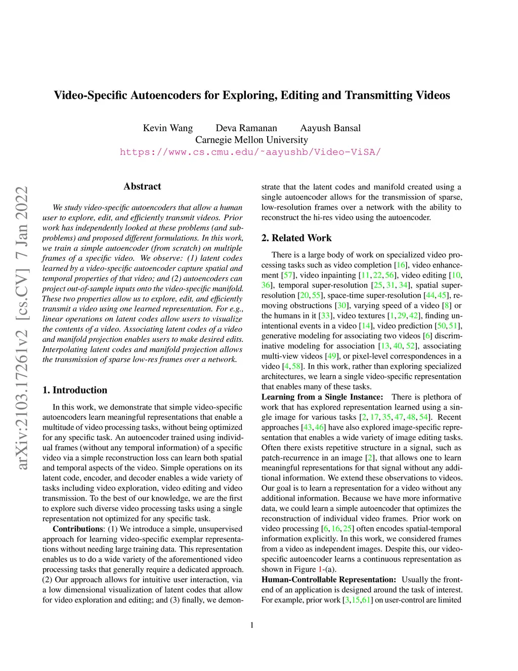We study video-specific autoencoders that allow a human user to explore, edit, and efficiently transmit videos. Prior work has independently looked at these problems (and sub-problems) and proposed different formulations. In this work, we train a simple autoencoder (from scratch) on multiple frames of a specific video. We observe: (1) latent codes learned by a video-specific autoencoder capture spatial and temporal properties of that video; and (2) autoencoders can project out-of-sample inputs onto the video-specific manifold. These two properties allow us to explore, edit, and efficiently transmit a video using one learned representation. For e.g., linear operations on latent codes allow users to visualize the contents of a video. Associating latent codes of a video and manifold projection enables users to make desired edits. Interpolating latent codes and manifold projection allows the transmission of sparse low-res frames over a network.