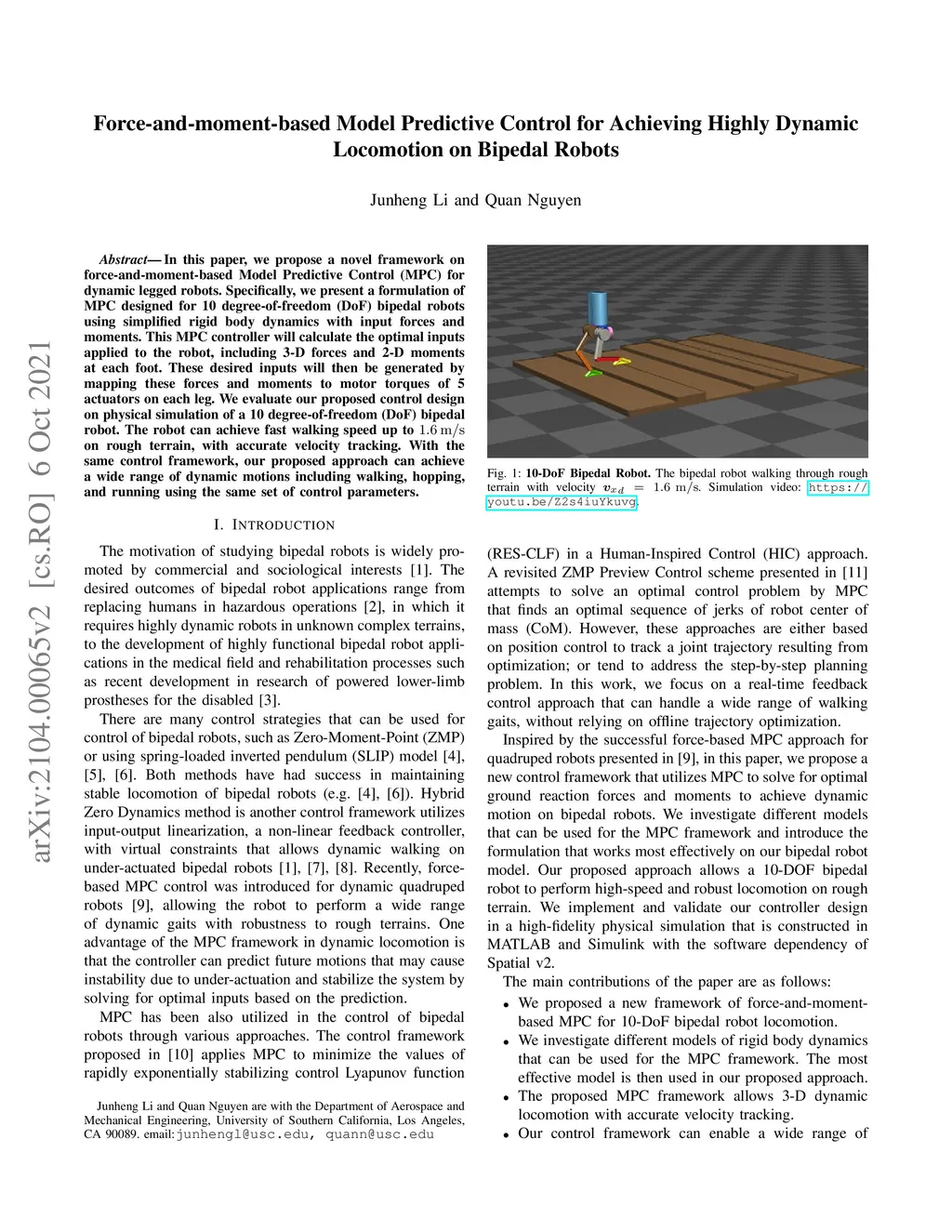 In this paper, we propose a novel framework on force-and-moment-based Model Predictive Control (MPC) for dynamic legged robots. Specifically, we present a formulation of MPC designed for 10 degree-of-freedom (DoF) bipedal robots using simplified rigid body dynamics with input forces and moments. This MPC controller will calculate the optimal inputs applied to the robot, including 3-D forces and 2-D moments at each foot. These desired inputs will then be generated by mapping these forces and moments to motor torques of 5 actuators on each leg. We evaluate our proposed control design on physical simulation of a 10 degree-of-freedom (DoF) bipedal robot. The robot can achieve fast walking speed up to 1.6 m/s on rough terrain, with accurate velocity tracking. With the same control framework, our proposed approach can achieve a wide range of dynamic motions including walking, hopping, and running using the same set of control parameters.