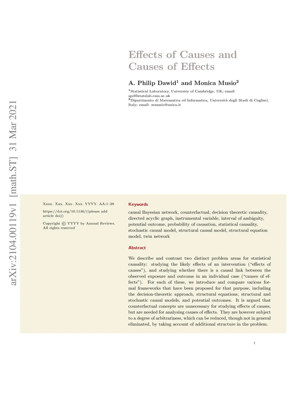 We describe and contrast two distinct problem areas for statistical causality: studying the likely effects of an intervention ("effects of causes"), and studying whether there is a causal link between the observed exposure and outcome in an individual case ("causes of effects"). For each of these, we introduce and compare various formal frameworks that have been proposed for that purpose, including the decision-theoretic approach, structural equations, structural and stochastic causal models, and potential outcomes. It is argued that counterfactual concepts are unnecessary for studying effects of causes, but are needed for analysing causes of effects. They are however subject to a degree of arbitrariness, which can be reduced, though not in general eliminated, by taking account of additional structure in the problem.