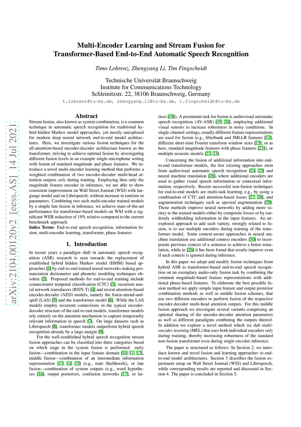 Stream fusion, also known as system combination, is a common technique in automatic speech recognition for traditional hybrid hidden Markov model approaches, yet mostly unexplored for modern deep neural network end-to-end model architectures. Here, we investigate various fusion techniques for the all-attention-based encoder-decoder architecture known as the transformer, striving to achieve optimal fusion by investigating different fusion levels in an example single-microphone setting with fusion of standard magnitude and phase features. We introduce a novel multi-encoder learning method that performs a weighted combination of two encoder-decoder multi-head attention outputs only during training. Employing then only the magnitude feature encoder in inference, we are able to show consistent improvement on Wall Street Journal (WSJ) with language model and on Librispeech, without increase in runtime or parameters. Combining two such multi-encoder trained models by a simple late fusion in inference, we achieve state-of-the-art performance for transformer-based models on WSJ with a significant WER reduction of 19% relative compared to the current benchmark approach.