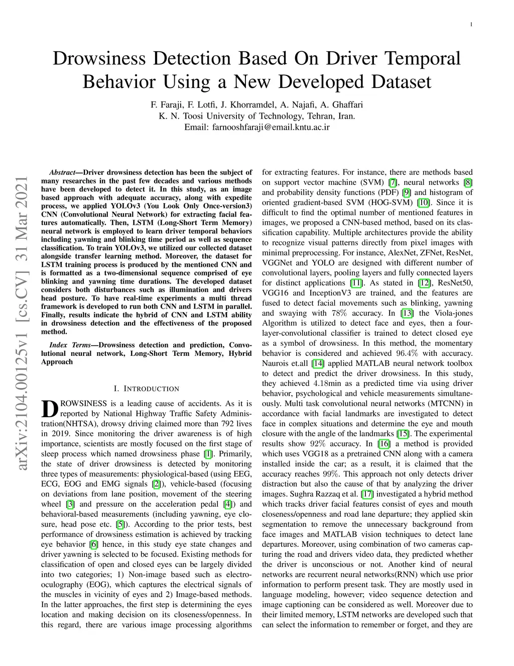 Driver drowsiness detection has been the subject of many researches in the past few decades and various methods have been developed to detect it. In this study, as an image-based approach with adequate accuracy, along with the expedite process, we applied YOLOv3 (You Look Only Once-version3) CNN (Convolutional Neural Network) for extracting facial features automatically. Then, LSTM (Long-Short Term Memory) neural network is employed to learn driver temporal behaviors including yawning and blinking time period as well as sequence classification. To train YOLOv3, we utilized our collected dataset alongside the transfer learning method. Moreover, the dataset for the LSTM training process is produced by the mentioned CNN and is formatted as a two-dimensional sequence comprised of eye blinking and yawning time durations. The developed dataset considers both disturbances such as illumination and drivers' head posture. To have real-time experiments a multi-thread framework is developed to run both CNN and LSTM in parallel. Finally, results indicate the hybrid of CNN and LSTM ability in drowsiness detection and the effectiveness of the proposed method.