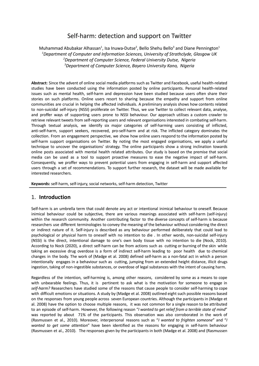 Since the advent of online social media platforms such as Twitter and Facebook, useful health-related studies have been conducted using the information posted by online participants. Personal health-related issues such as mental health, self-harm and depression have been studied because users often share their stories on such platforms. Online users resort to sharing because the empathy and support from online communities are crucial in helping the affected individuals. A preliminary analysis shows how contents related to non-suicidal self-injury (NSSI) proliferate on Twitter. Thus, we use Twitter to collect relevant data, analyse, and proffer ways of supporting users prone to NSSI behaviour. Our approach utilises a custom crawler to retrieve relevant tweets from self-reporting users and relevant organisations interested in combating self-harm. Through textual analysis, we identify six major categories of self-harming users consisting of inflicted, anti-self-harm, support seekers, recovered, pro-self-harm and at risk. The inflicted category dominates the collection. From an engagement perspective, we show how online users respond to the information posted by self-harm support organisations on Twitter. By noting the most engaged organisations, we apply a useful technique to uncover the organisations' strategy. The online participants show a strong inclination towards online posts associated with mental health related attributes. Our study is based on the premise that social media can be used as a tool to support proactive measures to ease the negative impact of self-harm. Consequently, we proffer ways to prevent potential users from engaging in self-harm and support affected users through a set of recommendations. To support further research, the dataset will be made available for interested researchers.