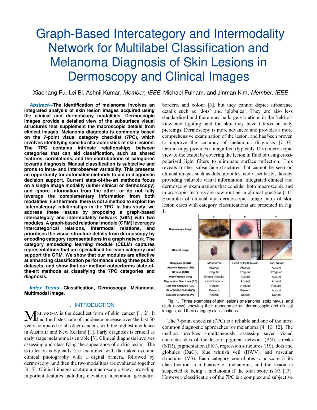 The identification of melanoma involves an integrated analysis of skin lesion images acquired using the clinical and dermoscopy modalities. Dermoscopic images provide a detailed view of the subsurface visual structures that supplement the macroscopic clinical images. Melanoma diagnosis is commonly based on the 7-point visual category checklist (7PC). The 7PC contains intrinsic relationships between categories that can aid classification, such as shared features, correlations, and the contributions of categories towards diagnosis. Manual classification is subjective and prone to intra- and interobserver variability. This presents an opportunity for automated methods to improve diagnosis. Current state-of-the-art methods focus on a single image modality and ignore information from the other, or do not fully leverage the complementary information from both modalities. Further, there is not a method to exploit the intercategory relationships in the 7PC. In this study, we address these issues by proposing a graph-based intercategory and intermodality network (GIIN) with two modules. A graph-based relational module (GRM) leverages intercategorical relations, intermodal relations, and prioritises the visual structure details from dermoscopy by encoding category representations in a graph network. The category embedding learning module (CELM) captures representations that are specialised for each category and support the GRM. We show that our modules are effective at enhancing classification performance using a public dataset of dermoscopy-clinical images, and show that our method outperforms the state-of-the-art at classifying the 7PC categories and diagnosis.