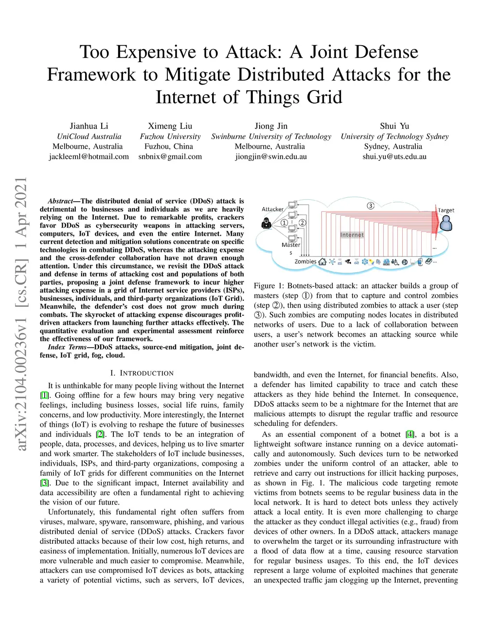 The distributed denial of service (DDoS) attack is detrimental to businesses and individuals as we are heavily relying on the Internet. Due to remarkable profits, crackers favor DDoS as cybersecurity weapons in attacking servers, computers, IoT devices, and even the entire Internet. Many current detection and mitigation solutions concentrate on specific technologies in combating DDoS, whereas the attacking expense and the cross-defender collaboration have not drawn enough attention. Under this circumstance, we revisit the DDoS attack and defense in terms of attacking cost and populations of both parties, proposing a joint defense framework to incur higher attacking expense in a grid of Internet service providers (ISPs), businesses, individuals, and third-party organizations (IoT Grid). Meanwhile, the defender's cost does not grow much during combats. The skyrocket of attacking expense discourages profit-driven attackers from launching further attacks effectively. The quantitative evaluation and experimental assessment reinforce the effectiveness of our framework.