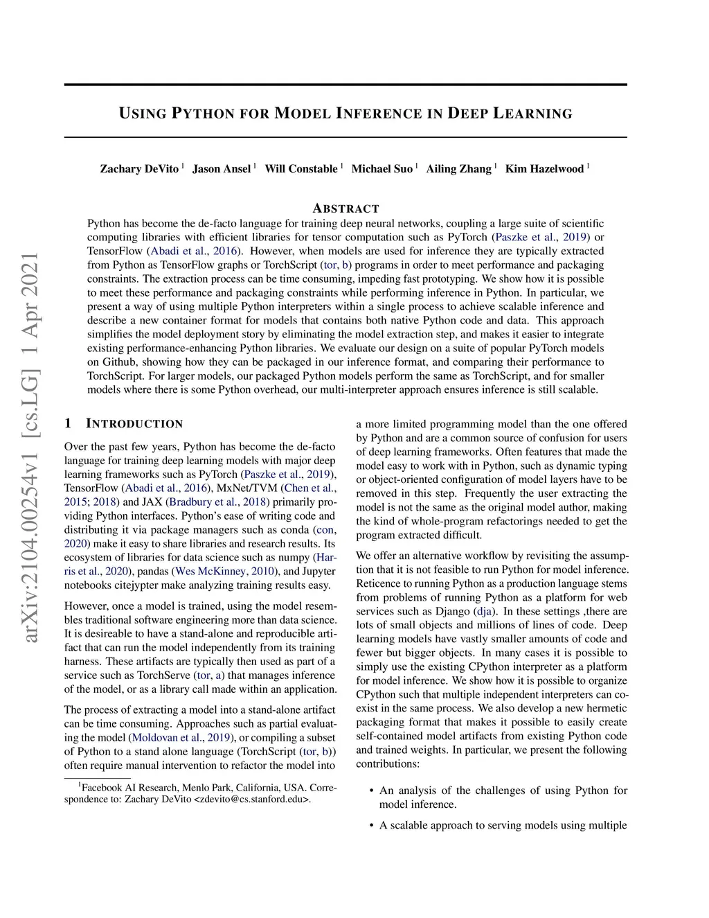 Python has become the de-facto language for training deep neural networks, coupling a large suite of scientific computing libraries with efficient libraries for tensor computation such as PyTorch or TensorFlow. However, when models are used for inference they are typically extracted from Python as TensorFlow graphs or TorchScript programs in order to meet performance and packaging constraints. The extraction process can be time consuming, impeding fast prototyping. We show how it is possible to meet these performance and packaging constraints while performing inference in Python. In particular, we present a way of using multiple Python interpreters within a single process to achieve scalable inference and describe a new container format for models that contains both native Python code and data. This approach simplifies the model deployment story by eliminating the model extraction step, and makes it easier to integrate existing performance-enhancing Python libraries. We evaluate our design on a suite of popular PyTorch models on Github, showing how they can be packaged in our inference format, and comparing their performance to TorchScript. For larger models, our packaged Python models perform the same as TorchScript, and for smaller models where there is some Python overhead, our multi-interpreter approach ensures inference is still scalable.