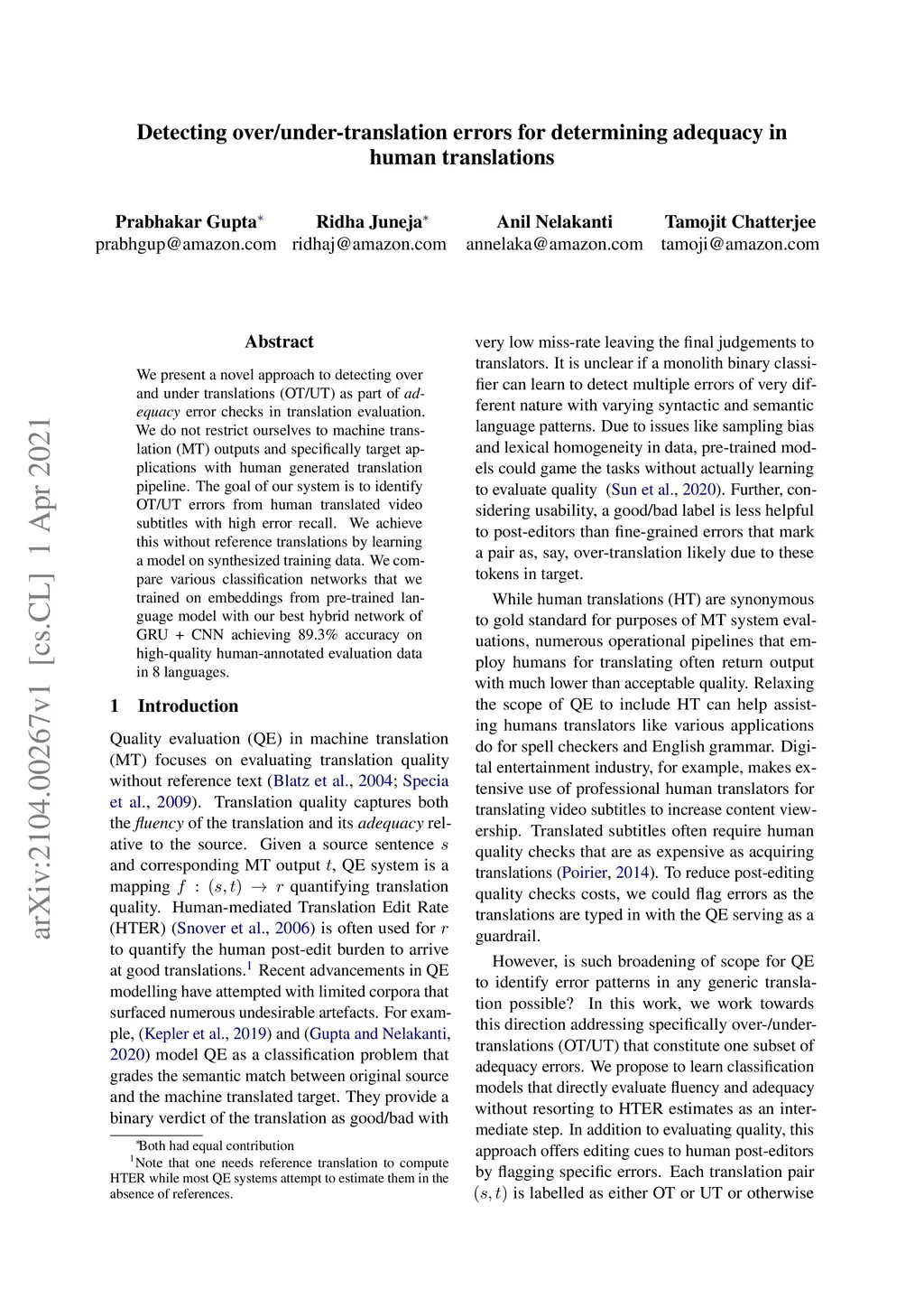 We present a novel approach to detecting over and under translations (OT/UT) as part of adequacy error checks in translation evaluation. We do not restrict ourselves to machine translation (MT) outputs and specifically target applications with human generated translation pipeline. The goal of our system is to identify OT/UT errors from human translated video subtitles with high error recall. We achieve this without reference translations by learning a model on synthesized training data. We compare various classification networks that we trained on embeddings from pre-trained language model with our best hybrid network of GRU + CNN achieving 89.3% accuracy on high-quality human-annotated evaluation data in 8 languages.