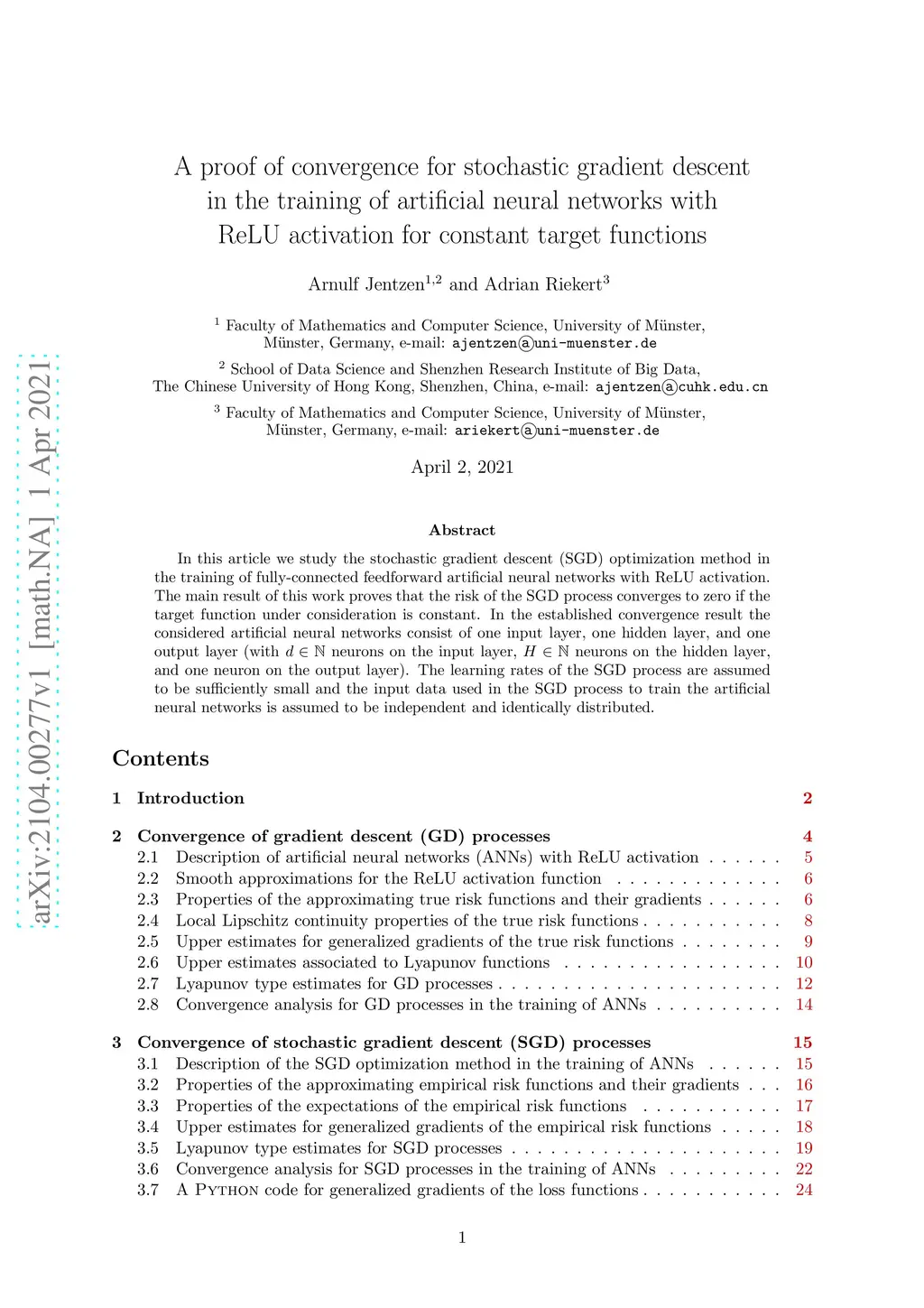In this article we study the stochastic gradient descent (SGD) optimization method in the training of fully-connected feedforward artificial neural networks with ReLU activation. The main result of this work proves that the risk of the SGD process converges to zero if the target function under consideration is constant. In the established convergence result the considered artificial neural networks consist of one input layer, one hidden layer, and one output layer (with neurons on the input layer, neurons on the hidden layer, and one neuron on the output layer). The learning rates of the SGD process are assumed to be sufficiently small and the input data used in the SGD process to train the artificial neural networks is assumed to be independent and identically distributed.