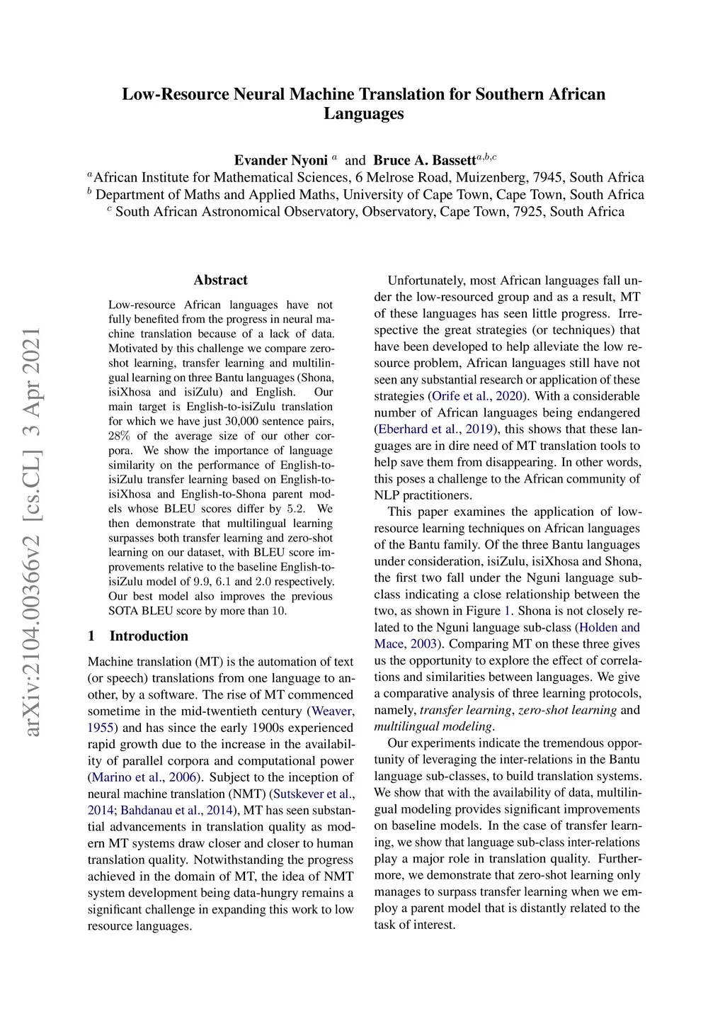 Low-resource African languages have not fully benefited from the progress in neural machine translation because of a lack of data. Motivated by this challenge we compare zero-shot learning, transfer learning and multilingual learning on three Bantu languages (Shona, isiXhosa and isiZulu) and English. Our main target is English-to-isiZulu translation for which we have just 30,000 sentence pairs, 28% of the average size of our other corpora. We show the importance of language similarity on the performance of English-to-isiZulu transfer learning based on English-to-isiXhosa and English-to-Shona parent models whose BLEU scores differ by 5.2. We then demonstrate that multilingual learning surpasses both transfer learning and zero-shot learning on our dataset, with BLEU score improvements relative to the baseline English-to-isiZulu model of 9.9, 6.1 and 2.0 respectively. Our best model also improves the previous SOTA BLEU score by more than 10.