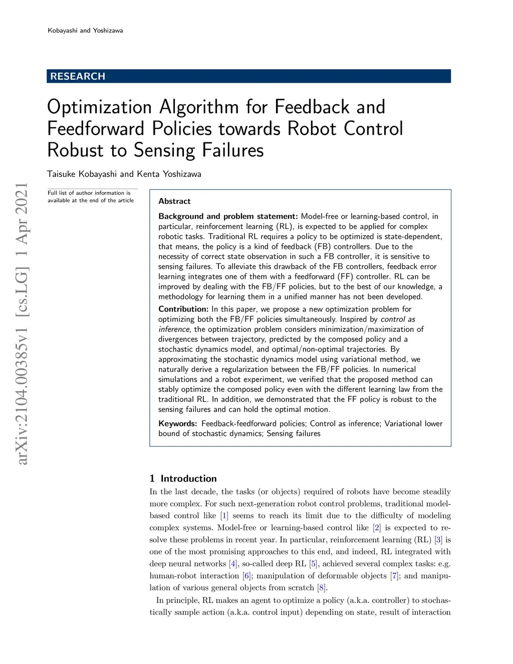 Model-free or learning-based control, in particular, reinforcement learning (RL), is expected to be applied for complex robotic tasks. Traditional RL requires a policy to be optimized is state-dependent, that means, the policy is a kind of feedback (FB) controllers. Due to the necessity of correct state observation in such a FB controller, it is sensitive to sensing failures. To alleviate this drawback of the FB controllers, feedback error learning integrates one of them with a feedforward (FF) controller. RL can be improved by dealing with the FB/FF policies, but to the best of our knowledge, a methodology for learning them in a unified manner has not been developed. In this paper, we propose a new optimization problem for optimizing both the FB/FF policies simultaneously. Inspired by control as inference, the optimization problem considers minimization/maximization of divergences between trajectory, predicted by the composed policy and a stochastic dynamics model, and optimal/non-optimal trajectories. By approximating the stochastic dynamics model using variational method, we naturally derive a regularization between the FB/FF policies. In numerical simulations and a robot experiment, we verified that the proposed method can stably optimize the composed policy even with the different learning law from the traditional RL. In addition, we demonstrated that the FF policy is robust to the sensing failures and can hold the optimal motion. Attached video is also uploaded on youtube: https://youtu.be/zLL4uXIRmrE