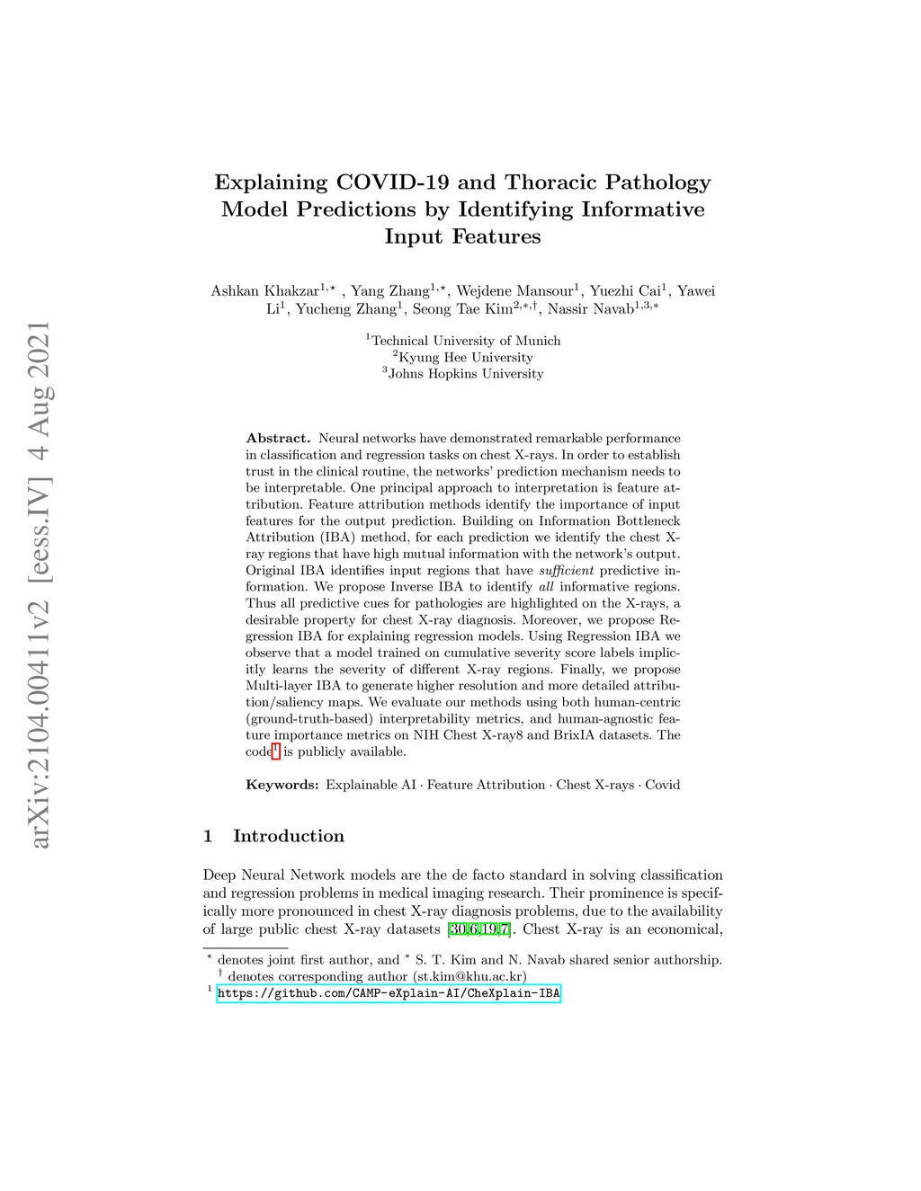 Neural networks have demonstrated remarkable performance in classification and regression tasks on chest X-rays. In order to establish trust in the clinical routine, the networks' prediction mechanism needs to be interpretable. One principal approach to interpretation is feature attribution. Feature attribution methods identify the importance of input features for the output prediction. Building on Information Bottleneck Attribution (IBA) method, for each prediction we identify the chest X-ray regions that have high mutual information with the network's output. Original IBA identifies input regions that have sufficient predictive information. We propose Inverse IBA to identify all informative regions. Thus all predictive cues for pathologies are highlighted on the X-rays, a desirable property for chest X-ray diagnosis. Moreover, we propose Regression IBA for explaining regression models. Using Regression IBA we observe that a model trained on cumulative severity score labels implicitly learns the severity of different X-ray regions. Finally, we propose Multi-layer IBA to generate higher resolution and more detailed attribution/saliency maps. We evaluate our methods using both human-centric (ground-truth-based) interpretability metrics, and human-independent feature importance metrics on NIH Chest X-ray8 and BrixIA datasets. The Code is publicly available.