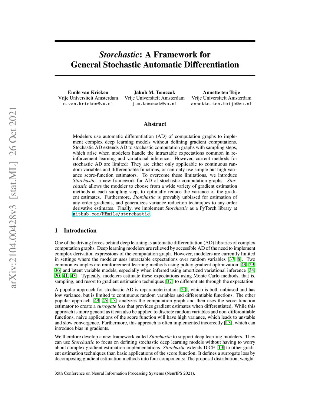 Modelers use automatic differentiation (AD) of computation graphs to implement complex Deep Learning models without defining gradient computations. Stochastic AD extends AD to stochastic computation graphs with sampling steps, which arise when modelers handle the intractable expectations common in Reinforcement Learning and Variational Inference. However, current methods for stochastic AD are limited: They are either only applicable to continuous random variables and differentiable functions, or can only use simple but high variance score-function estimators. To overcome these limitations, we introduce Storchastic, a new framework for AD of stochastic computation graphs. Storchastic allows the modeler to choose from a wide variety of gradient estimation methods at each sampling step, to optimally reduce the variance of the gradient estimates. Furthermore, Storchastic is provably unbiased for estimation of any-order gradients, and generalizes variance reduction techniques to higher-order gradient estimates. Finally, we implement Storchastic as a PyTorch library at https://github.com/HEmile/storchastic.