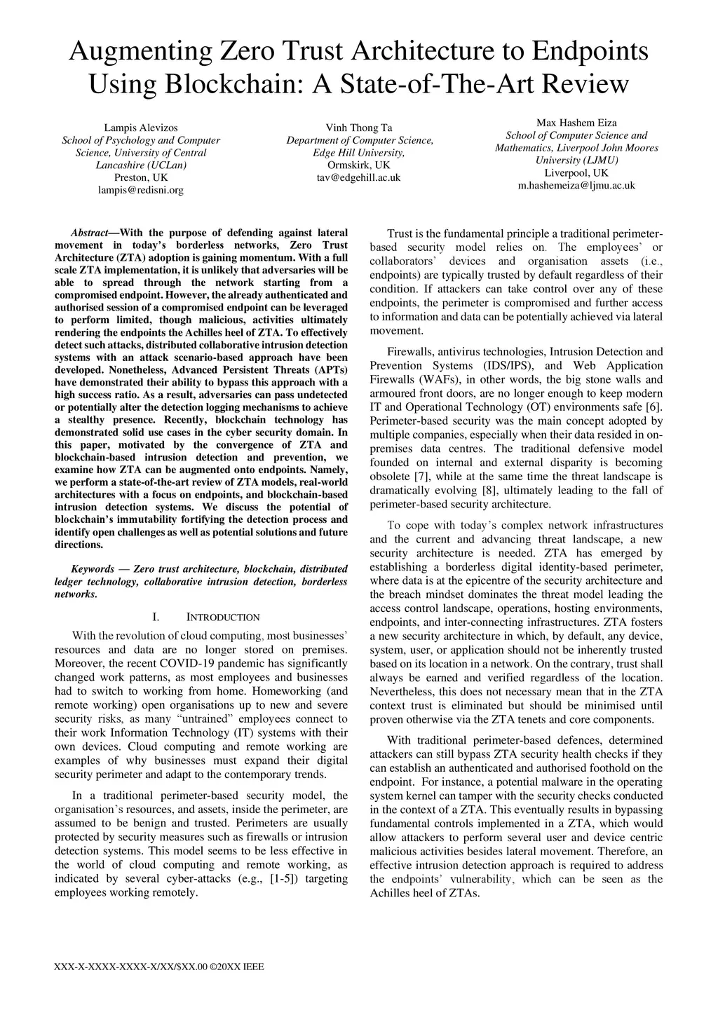 With the purpose of defending against lateral movement in today's borderless networks, Zero Trust Architecture (ZTA) adoption is gaining momentum. With a full scale ZTA implementation, it is unlikely that adversaries will be able to spread through the network starting from a compromised endpoint. However, the already authenticated and authorised session of a compromised endpoint can be leveraged to perform limited, though malicious, activities ultimately rendering the endpoints the Achilles heel of ZTA. To effectively detect such attacks, distributed collaborative intrusion detection systems with an attack scenario-based approach have been developed. Nonetheless, Advanced Persistent Threats (APTs) have demonstrated their ability to bypass this approach with a high success ratio. As a result, adversaries can pass undetected or potentially alter the detection logging mechanisms to achieve a stealthy presence. Recently, blockchain technology has demonstrated solid use cases in the cyber security domain. In this paper, motivated by the convergence of ZTA and blockchain-based intrusion detection and prevention, we examine how ZTA can be augmented onto endpoints. Namely, we perform a state-of-the-art review of ZTA models, real-world architectures with a focus on endpoints, and blockchain-based intrusion detection systems. We discuss the potential of blockchain's immutability fortifying the detection process and identify open challenges as well as potential solutions and future directions.