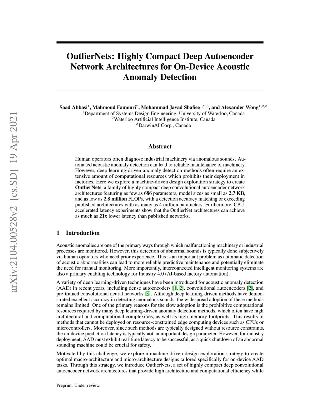 Human operators often diagnose industrial machinery via anomalous sounds. Automated acoustic anomaly detection can lead to reliable maintenance of machinery. However, deep learning-driven anomaly detection methods often require an extensive amount of computational resources which prohibits their deployment in factories. Here we explore a machine-driven design exploration strategy to create OutlierNets, a family of highly compact deep convolutional autoencoder network architectures featuring as few as 686 parameters, model sizes as small as 2.7 KB, and as low as 2.8 million FLOPs, with a detection accuracy matching or exceeding published architectures with as many as 4 million parameters. Furthermore, CPU-accelerated latency experiments show that the OutlierNet architectures can achieve as much as 21x lower latency than published networks.