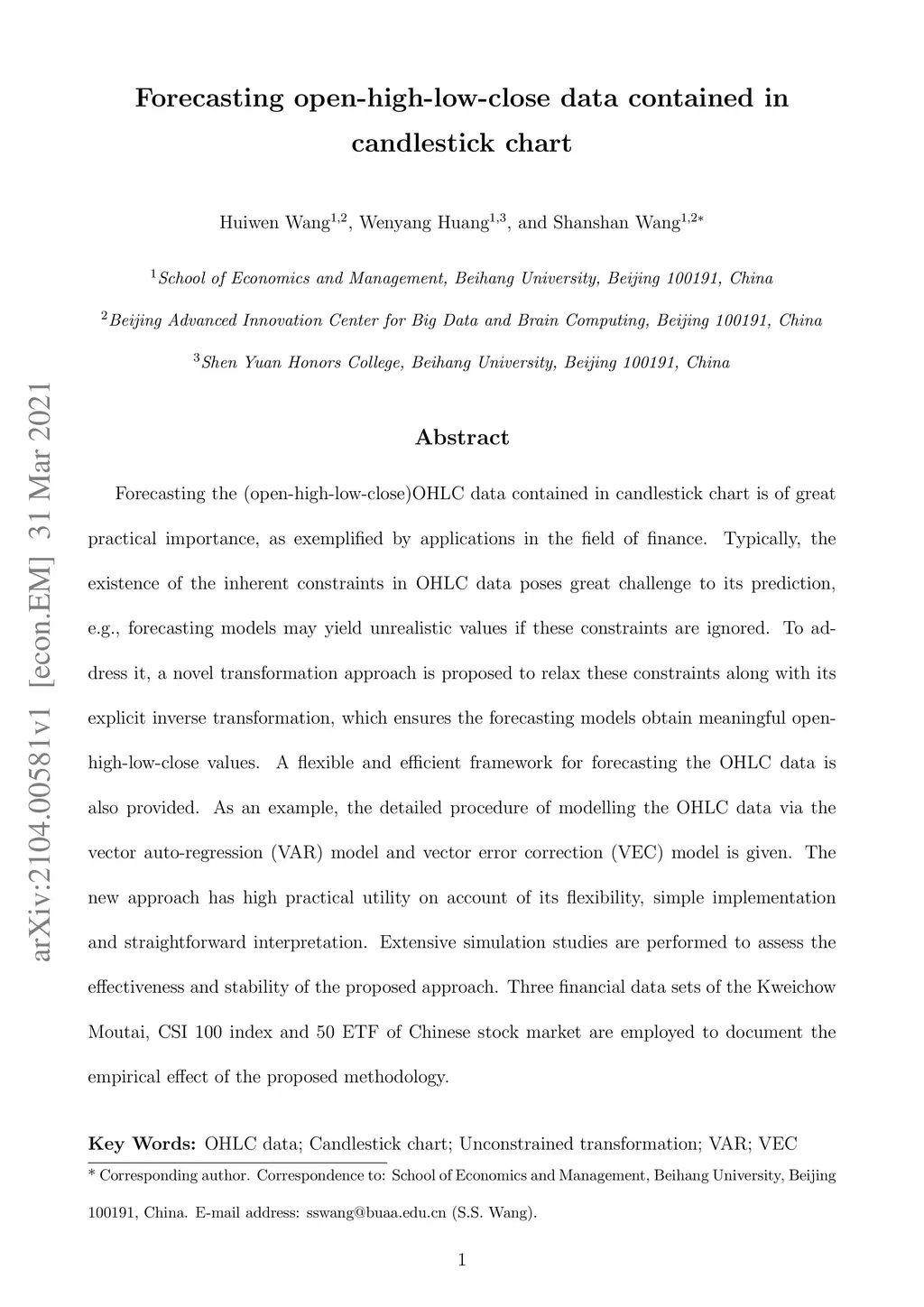 Forecasting the (open-high-low-close)OHLC data contained in candlestick chart is of great practical importance, as exemplified by applications in the field of finance. Typically, the existence of the inherent constraints in OHLC data poses great challenge to its prediction, e.g., forecasting models may yield unrealistic values if these constraints are ignored. To address it, a novel transformation approach is proposed to relax these constraints along with its explicit inverse transformation, which ensures the forecasting models obtain meaningful openhigh-low-close values. A flexible and efficient framework for forecasting the OHLC data is also provided. As an example, the detailed procedure of modelling the OHLC data via the vector auto-regression (VAR) model and vector error correction (VEC) model is given. The new approach has high practical utility on account of its flexibility, simple implementation and straightforward interpretation. Extensive simulation studies are performed to assess the effectiveness and stability of the proposed approach. Three financial data sets of the Kweichow Moutai, CSI 100 index and 50 ETF of Chinese stock market are employed to document the empirical effect of the proposed methodology.