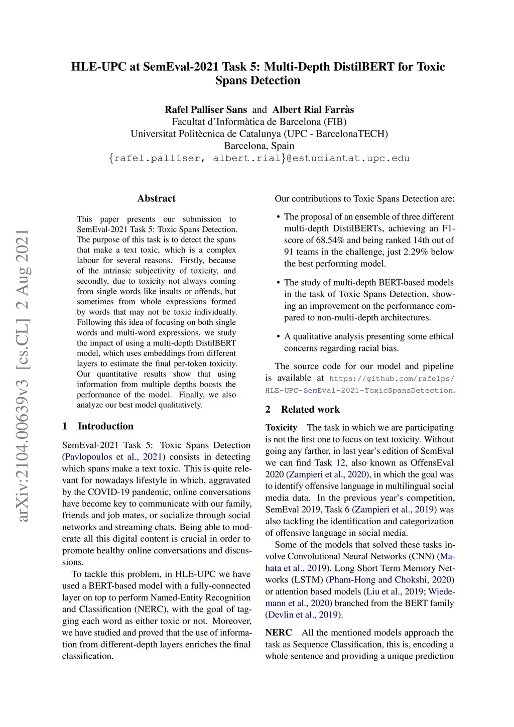 HLE-UPC at SemEval-2021 Task 5: Multi-Depth DistilBERT for Toxic Spans