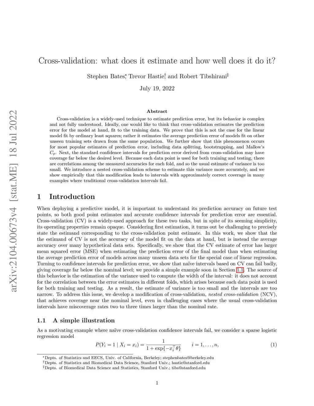 Cross-validation is a widely-used technique to estimate prediction error, but its behavior is complex and not fully understood. Ideally, one would like to think that cross-validation estimates the prediction error for the model at hand, fit to the training data. We prove that this is not the case for the linear model fit by ordinary least squares; rather it estimates the average prediction error of models fit on other unseen training sets drawn from the same population. We further show that this phenomenon occurs for most popular estimates of prediction error, including data splitting, bootstrapping, and Mallow's Cp. Next, the standard confidence intervals for prediction error derived from cross-validation may have coverage far below the desired level. Because each data point is used for both training and testing, there are correlations among the measured accuracies for each fold, and so the usual estimate of variance is too small. We introduce a nested cross-validation scheme to estimate this variance more accurately, and show empirically that this modification leads to intervals with approximately correct coverage in many examples where traditional cross-validation intervals fail. Lastly, our analysis also shows that when producing confidence intervals for prediction accuracy with simple data splitting, one should not re-fit the model on the combined data, since this invalidates the confidence intervals.