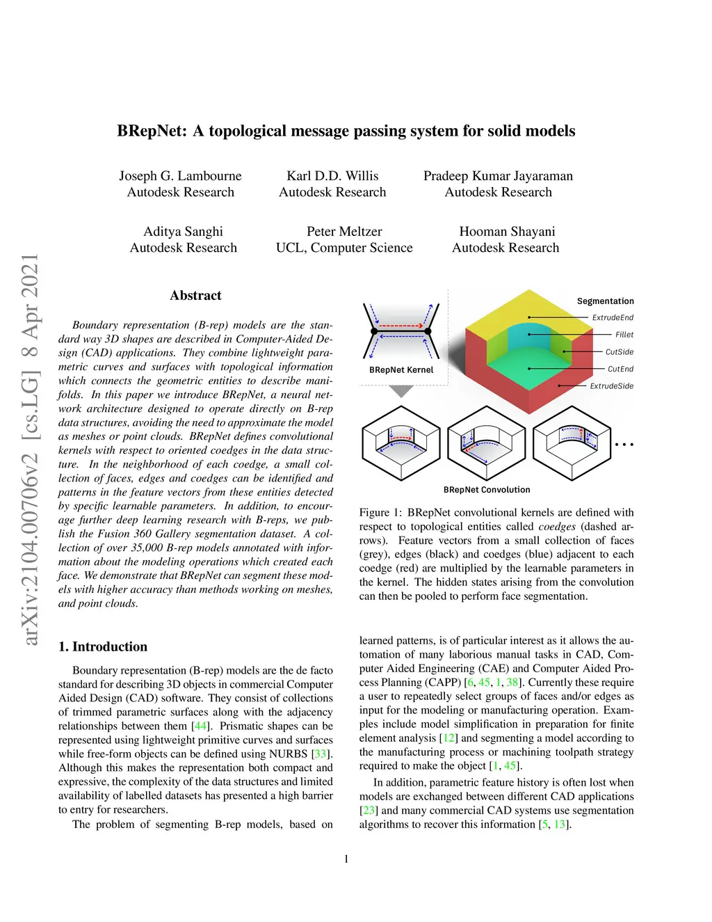 Boundary representation (B-rep) models are the standard way 3D shapes are described in Computer-Aided Design (CAD) applications. They combine lightweight parametric curves and surfaces with topological information which connects the geometric entities to describe manifolds. In this paper we introduce BRepNet, a neural network architecture designed to operate directly on B-rep data structures, avoiding the need to approximate the model as meshes or point clouds. BRepNet defines convolutional kernels with respect to oriented coedges in the data structure. In the neighborhood of each coedge, a small collection of faces, edges and coedges can be identified and patterns in the feature vectors from these entities detected by specific learnable parameters. In addition, to encourage further deep learning research with B-reps, we publish the Fusion 360 Gallery segmentation dataset. A collection of over 35,000 B-rep models annotated with information about the modeling operations which created each face. We demonstrate that BRepNet can segment these models with higher accuracy than methods working on meshes, and point clouds.