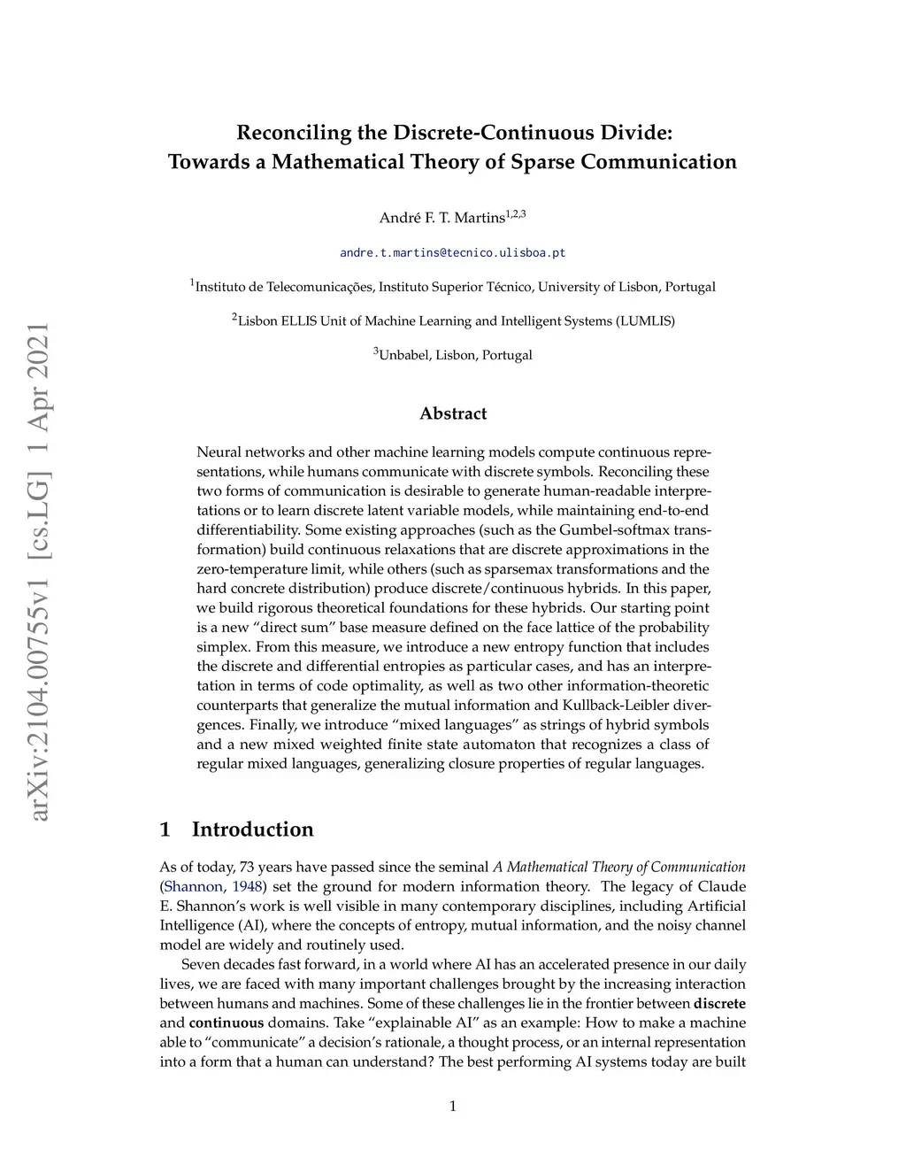 Neural networks and other machine learning models compute continuous representations, while humans communicate with discrete symbols. Reconciling these two forms of communication is desirable to generate human-readable interpretations or to learn discrete latent variable models, while maintaining end-to-end differentiability. Some existing approaches (such as the Gumbel-softmax transformation) build continuous relaxations that are discrete approximations in the zero-temperature limit, while others (such as sparsemax transformations and the hard concrete distribution) produce discrete/continuous hybrids. In this paper, we build rigorous theoretical foundations for these hybrids. Our starting point is a new "direct sum" base measure defined on the face lattice of the probability simplex. From this measure, we introduce a new entropy function that includes the discrete and differential entropies as particular cases, and has an interpretation in terms of code optimality, as well as two other information-theoretic counterparts that generalize the mutual information and Kullback-Leibler divergences. Finally, we introduce "mixed languages" as strings of hybrid symbols and a new mixed weighted finite state automaton that recognizes a class of regular mixed languages, generalizing closure properties of regular languages.