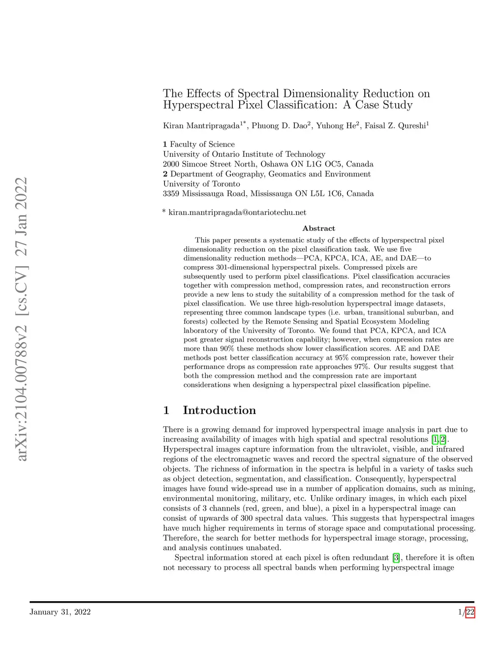 The Effects of Spectral Dimensionality Reduction on Hyperspectral Pixel