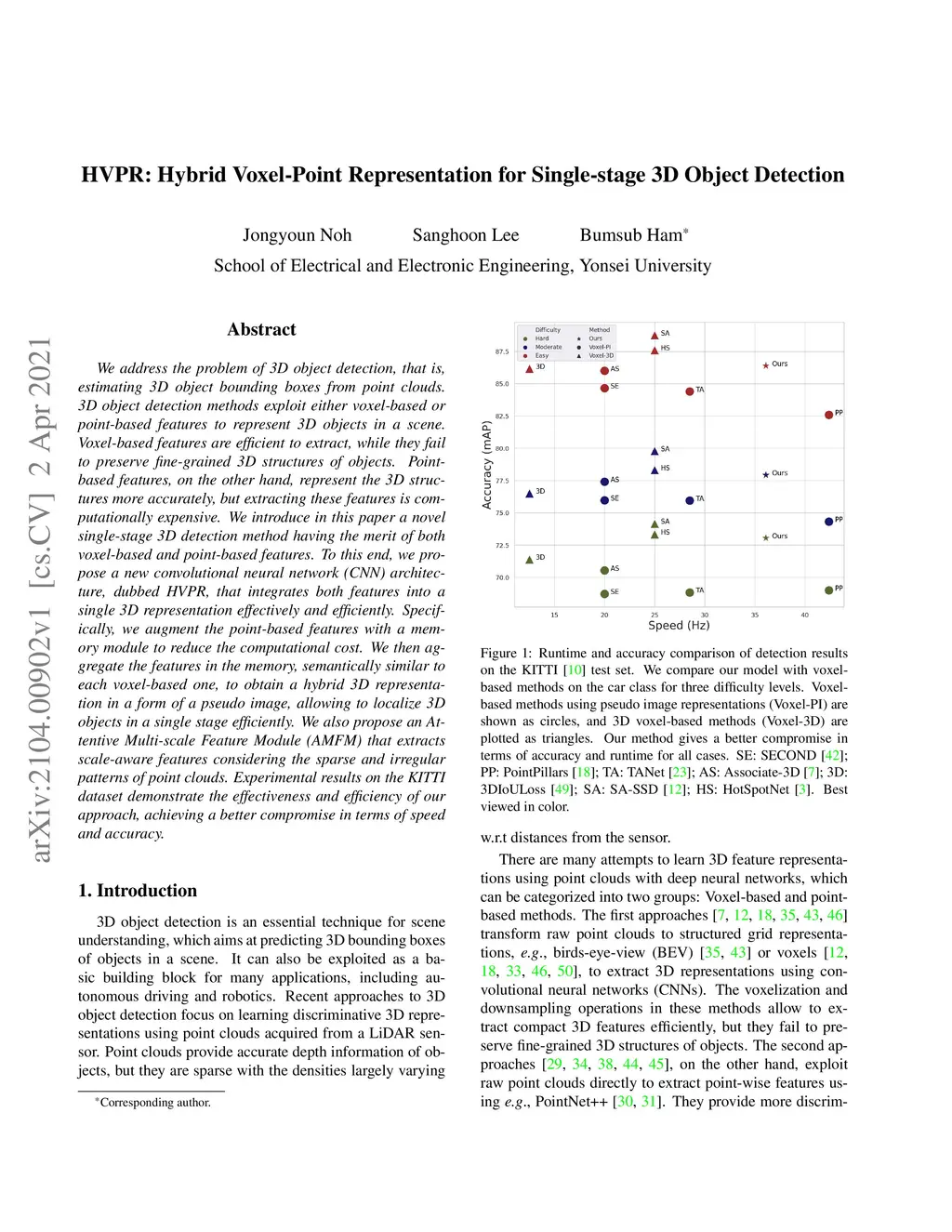 We address the problem of 3D object detection, that is, estimating 3D object bounding boxes from point clouds. 3D object detection methods exploit either voxel-based or point-based features to represent 3D objects in a scene. Voxel-based features are efficient to extract, while they fail to preserve fine-grained 3D structures of objects. Point-based features, on the other hand, represent the 3D structures more accurately, but extracting these features is computationally expensive. We introduce in this paper a novel single-stage 3D detection method having the merit of both voxel-based and point-based features. To this end, we propose a new convolutional neural network (CNN) architecture, dubbed HVPR, that integrates both features into a single 3D representation effectively and efficiently. Specifically, we augment the point-based features with a memory module to reduce the computational cost. We then aggregate the features in the memory, semantically similar to each voxel-based one, to obtain a hybrid 3D representation in a form of a pseudo image, allowing to localize 3D objects in a single stage efficiently. We also propose an Attentive Multi-scale Feature Module (AMFM) that extracts scale-aware features considering the sparse and irregular patterns of point clouds. Experimental results on the KITTI dataset demonstrate the effectiveness and efficiency of our approach, achieving a better compromise in terms of speed and accuracy.