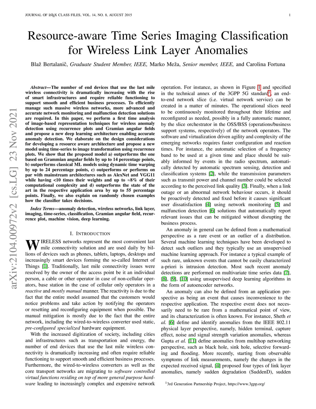 The number of end devices that use the last mile wireless connectivity is dramatically increasing with the rise of smart infrastructures and require reliable functioning to support smooth and efficient business processes. To efficiently manage such massive wireless networks, more advanced and accurate network monitoring and malfunction detection solutions are required. In this paper, we perform a first time analysis of image-based representation techniques for wireless anomaly detection using recurrence plots and Gramian angular fields and propose a new deep learning architecture enabling accurate anomaly detection. We elaborate on the design considerations for developing a resource aware architecture and propose a new model using time-series to image transformation using recurrence plots. We show that the proposed model a) outperforms the one based on Grammian angular fields by up to 14 percentage points, b) outperforms classical ML models using dynamic time warping by up to 24 percentage points, c) outperforms or performs on par with mainstream architectures such as AlexNet and VGG11 while having <10 times their weights and up to 8\% of their computational complexity and d) outperforms the state of the art in the respective application area by up to 55 percentage points. Finally, we also explain on randomly chosen examples how the classifier takes decisions.