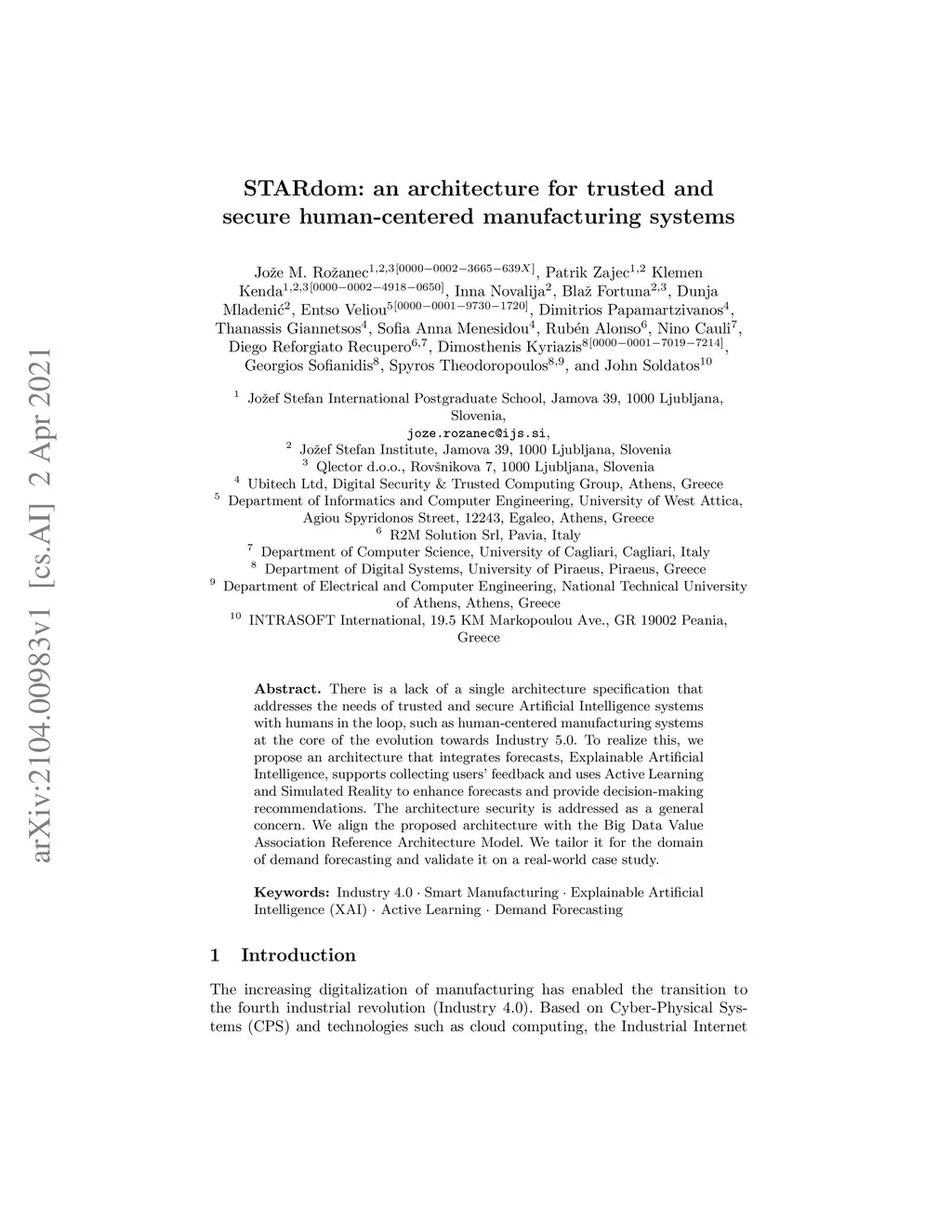 There is a lack of a single architecture specification that addresses the needs of trusted and secure Artificial Intelligence systems with humans in the loop, such as human-centered manufacturing systems at the core of the evolution towards Industry 5.0. To realize this, we propose an architecture that integrates forecasts, Explainable Artificial Intelligence, supports collecting users' feedback, and uses Active Learning and Simulated Reality to enhance forecasts and provide decision-making recommendations. The architecture security is addressed as a general concern. We align the proposed architecture with the Big Data Value Association Reference Architecture Model. We tailor it for the domain of demand forecasting and validate it on a real-world case study.
