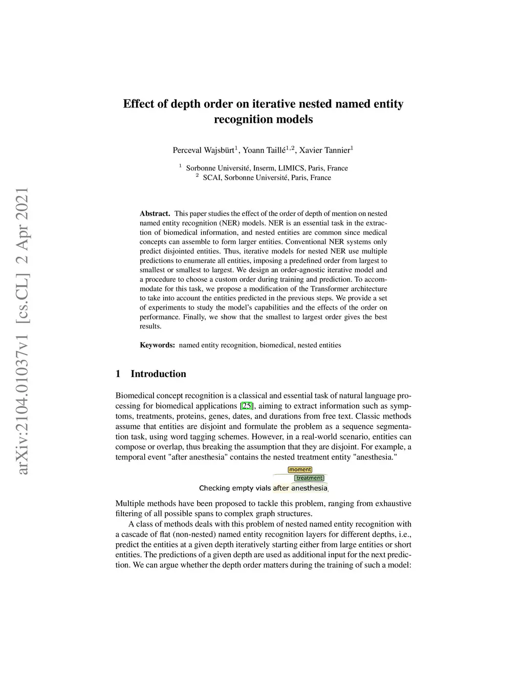 This paper studies the effect of the order of depth of mention on nested named entity recognition (NER) models. NER is an essential task in the extraction of biomedical information, and nested entities are common since medical concepts can assemble to form larger entities. Conventional NER systems only predict disjointed entities. Thus, iterative models for nested NER use multiple predictions to enumerate all entities, imposing a predefined order from largest to smallest or smallest to largest. We design an order-agnostic iterative model and a procedure to choose a custom order during training and prediction. To accommodate for this task, we propose a modification of the Transformer architecture to take into account the entities predicted in the previous steps. We provide a set of experiments to study the model's capabilities and the effects of the order on performance. Finally, we show that the smallest to largest order gives the best results.