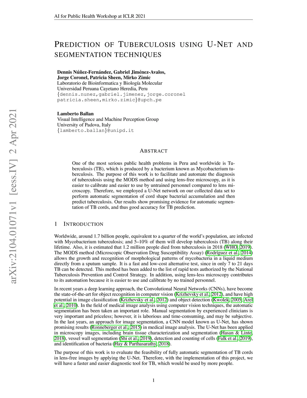 One of the most serious public health problems in Peru and worldwide is Tuberculosis (TB), which is produced by a bacterium known as Mycobacterium tuberculosis. The purpose of this work is to facilitate and automate the diagnosis of tuberculosis using the MODS method and using lens-free microscopy, as it is easier to calibrate and easier to use by untrained personnel compared to lens microscopy. Therefore, we employed a U-Net network on our collected data set to perform automatic segmentation of cord shape bacterial accumulation and then predict tuberculosis. Our results show promising evidence for automatic segmentation of TB cords, and thus good accuracy for TB prediction.