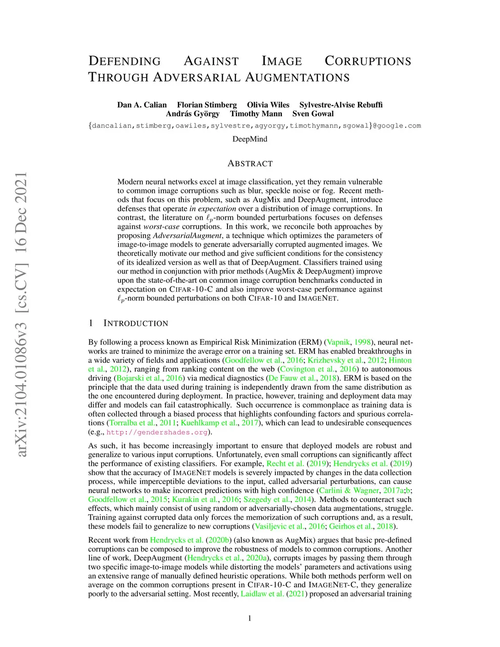 Modern neural networks excel at image classification, yet they remain vulnerable to common image corruptions such as blur, speckle noise or fog. Recent methods that focus on this problem, such as AugMix and DeepAugment, introduce defenses that operate in expectation over a distribution of image corruptions. In contrast, the literature on p\ell_p-norm bounded perturbations focuses on defenses against worst-case corruptions. In this work, we reconcile both approaches by proposing AdversarialAugment, a technique which optimizes the parameters of image-to-image models to generate adversarially corrupted augmented images. We theoretically motivate our method and give sufficient conditions for the consistency of its idealized version as well as that of DeepAugment. Our classifiers improve upon the state-of-the-art on common image corruption benchmarks conducted in expectation on CIFAR-10-C and improve worst-case performance against p\ell_p-norm bounded perturbations on both CIFAR-10 and ImageNet.