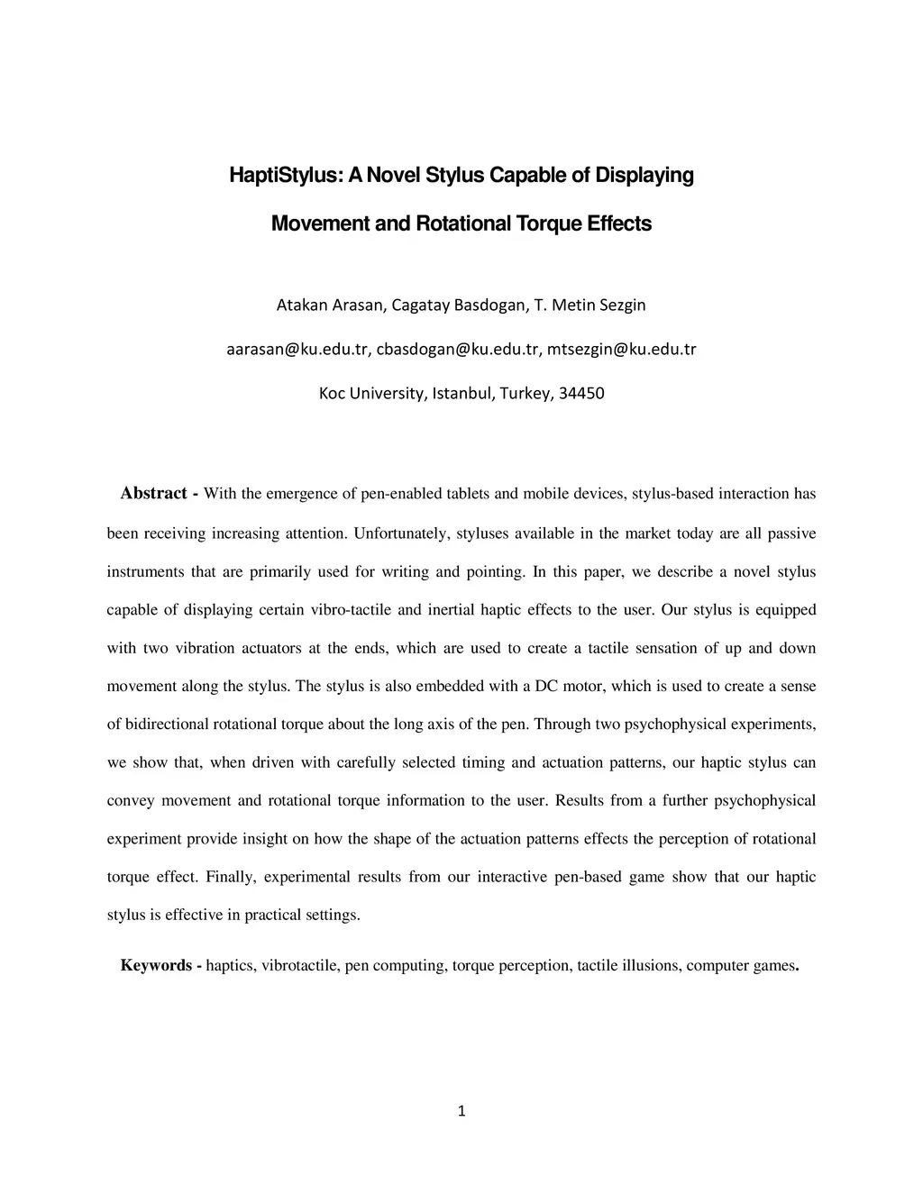 With the emergence of pen-enabled tablets and mobile devices, stylus-based interaction has been receiving increasing attention. Unfortunately, styluses available in the market today are all passive instruments that are primarily used for writing and pointing. In this paper, we describe a novel stylus capable of displaying certain vibro-tactile and inertial haptic effects to the user. Our stylus is equipped with two vibration actuators at the ends, which are used to create a tactile sensation of up and down movement along the stylus. The stylus is also embedded with a DC motor, which is used to create a sense of bidirectional rotational torque about the long axis of the pen. Through two psychophysical experiments, we show that, when driven with carefully selected timing and actuation patterns, our haptic stylus can convey movement and rotational torque information to the user. Results from a further psychophysical experiment provide insight on how the shape of the actuation patterns effects the perception of rotational torque effect. Finally, experimental results from our interactive pen-based game show that our haptic stylus is effective in practical settings