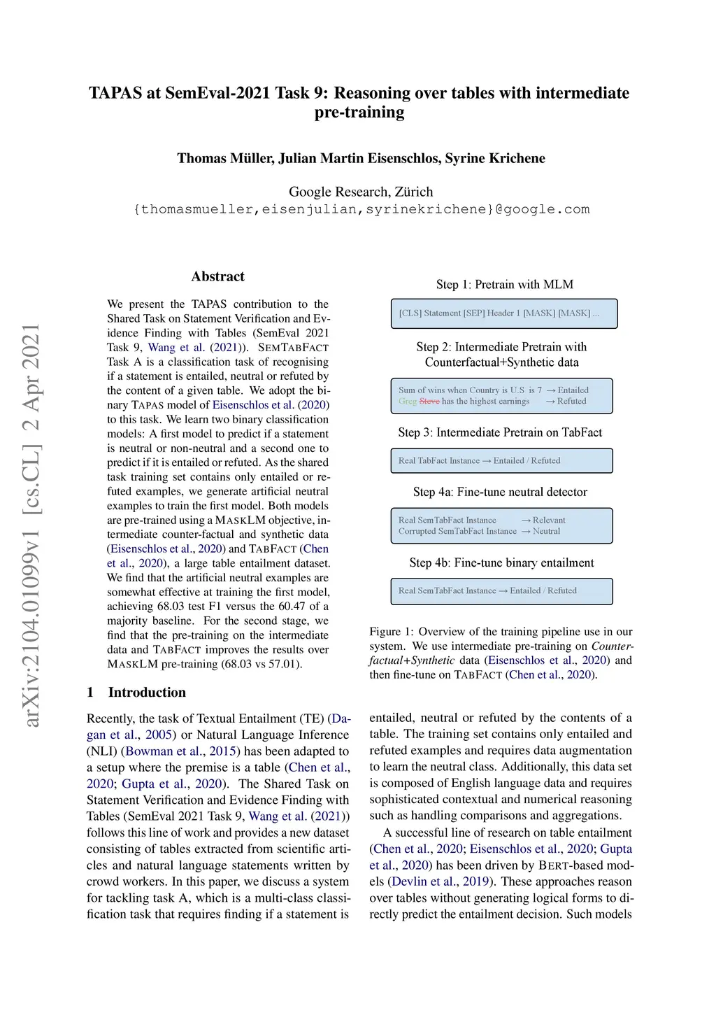 We present the TAPAS contribution to the Shared Task on Statement Verification and Evidence Finding with Tables (SemEval 2021 Task 9, Wang et al. (2021)). SEM TAB FACT Task A is a classification task of recognizing if a statement is entailed, neutral or refuted by the content of a given table. We adopt the binary TAPAS model of Eisenschlos et al. (2020) to this task. We learn two binary classification models: A first model to predict if a statement is neutral or non-neutral and a second one to predict if it is entailed or refuted. As the shared task training set contains only entailed or refuted examples, we generate artificial neutral examples to train the first model. Both models are pre-trained using a MASKLM objective, intermediate counter-factual and synthetic data (Eisenschlos et al., 2020) and TABFACT (Chen et al., 2020), a large table entailment dataset. We find that the artificial neutral examples are somewhat effective at training the first model, achieving 68.03 test F1 versus the 60.47 of a majority baseline. For the second stage, we find that the pre-training on the intermediate data and TABFACT improves the results over MASKLM pre-training (68.03 vs 57.01).
