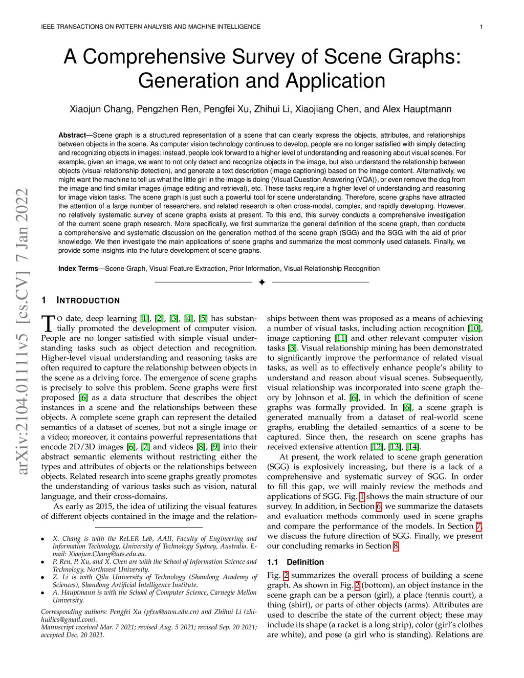 Scene graph is a structured representation of a scene that can clearly express the objects, attributes, and relationships between objects in the scene. As computer vision technology continues to develop, people are no longer satisfied with simply detecting and recognizing objects in images; instead, people look forward to a higher level of understanding and reasoning about visual scenes. For example, given an image, we want to not only detect and recognize objects in the image, but also know the relationship between objects (visual relationship detection), and generate a text description (image captioning) based on the image content. Alternatively, we might want the machine to tell us what the little girl in the image is doing (Visual Question Answering (VQA)), or even remove the dog from the image and find similar images (image editing and retrieval), etc. These tasks require a higher level of understanding and reasoning for image vision tasks. The scene graph is just such a powerful tool for scene understanding. Therefore, scene graphs have attracted the attention of a large number of researchers, and related research is often cross-modal, complex, and rapidly developing. However, no relatively systematic survey of scene graphs exists at present. To this end, this survey conducts a comprehensive investigation of the current scene graph research. More specifically, we first summarized the general definition of the scene graph, then conducted a comprehensive and systematic discussion on the generation method of the scene graph (SGG) and the SGG with the aid of prior knowledge. We then investigated the main applications of scene graphs and summarized the most commonly used datasets. Finally, we provide some insights into the future development of scene graphs. We believe this will be a very helpful foundation for future research on scene graphs.