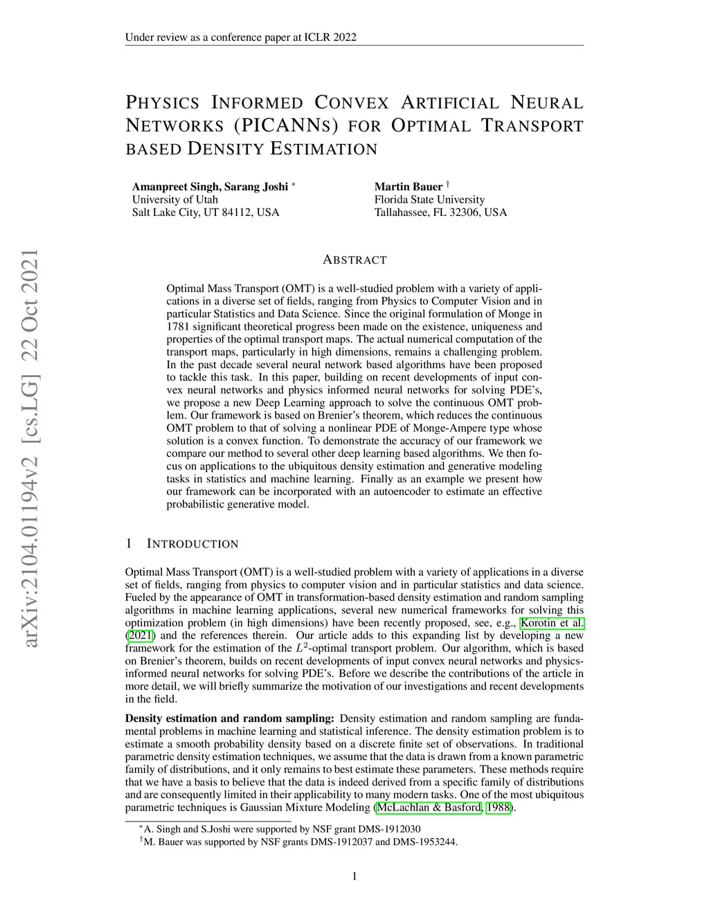 Optimal Mass Transport (OMT) is a well studied problem with a variety of applications in a diverse set of fields ranging from Physics to Computer Vision and in particular Statistics and Data Science. Since the original formulation of Monge in 1781 significant theoretical progress been made on the existence, uniqueness and properties of the optimal transport maps. The actual numerical computation of the transport maps, particularly in high dimensions, remains a challenging problem. By Brenier's theorem, the continuous OMT problem can be reduced to that of solving a non-linear PDE of Monge-Ampere type whose solution is a convex function. In this paper, building on recent developments of input convex neural networks and physics informed neural networks for solving PDE's, we propose a Deep Learning approach to solve the continuous OMT problem. To demonstrate the versatility of our framework we focus on the ubiquitous density estimation and generative modeling tasks in statistics and machine learning. Finally as an example we show how our framework can be incorporated with an autoencoder to estimate an effective probabilistic generative model.