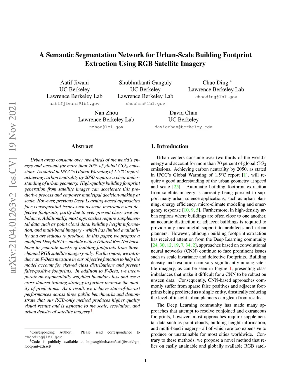 Urban areas consume over two-thirds of the world's energy and account for more than 70 percent of global CO2 emissions. As stated in IPCC's Global Warming of 1.5C report, achieving carbon neutrality by 2050 requires a clear understanding of urban geometry. High-quality building footprint generation from satellite images can accelerate this predictive process and empower municipal decision-making at scale. However, previous Deep Learning-based approaches face consequential issues such as scale invariance and defective footprints, partly due to ever-present class-wise imbalance. Additionally, most approaches require supplemental data such as point cloud data, building height information, and multi-band imagery - which has limited availability and are tedious to produce. In this paper, we propose a modified DeeplabV3+ module with a Dilated Res-Net backbone to generate masks of building footprints from three-channel RGB satellite imagery only. Furthermore, we introduce an F-Beta measure in our objective function to help the model account for skewed class distributions and prevent false-positive footprints. In addition to F-Beta, we incorporate an exponentially weighted boundary loss and use a cross-dataset training strategy to further increase the quality of predictions. As a result, we achieve state-of-the-art performances across three public benchmarks and demonstrate that our RGB-only method produces higher quality visual results and is agnostic to the scale, resolution, and urban density of satellite imagery.