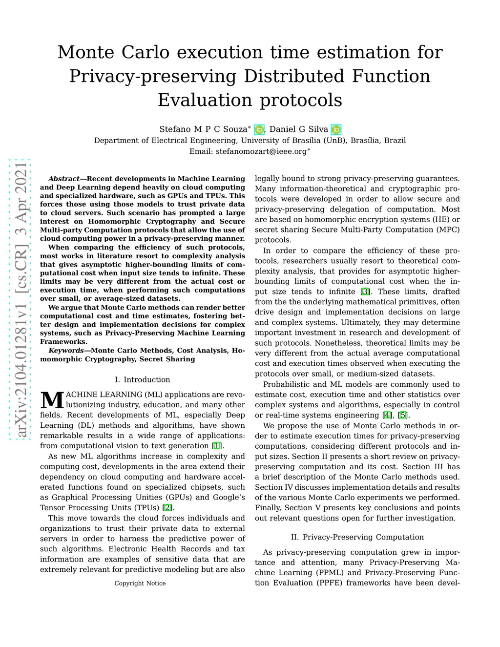 Recent developments in Machine Learning and Deep Learning depend heavily on cloud computing and specialized hardware, such as GPUs and TPUs. This forces those using those models to trust private data to cloud servers. Such scenario has prompted a large interest on Homomorphic Cryptography and Secure Multi-Party Computation protocols that allow the use of cloud computing power in a privacy-preserving manner. When comparing the efficiency of such protocols, most works in literature resort to complexity analysis that gives asymptotic higher-bounding limits of computational cost when input size tends to infinite. These limits may be very different from the actual cost or execution time, when performing such computations over small, or average-sized datasets. We argue that Monte Carlo methods can render better computational cost and time estimates, fostering better design and implementation decisions for complex systems, such as Privacy-Preserving Machine Learning Frameworks.