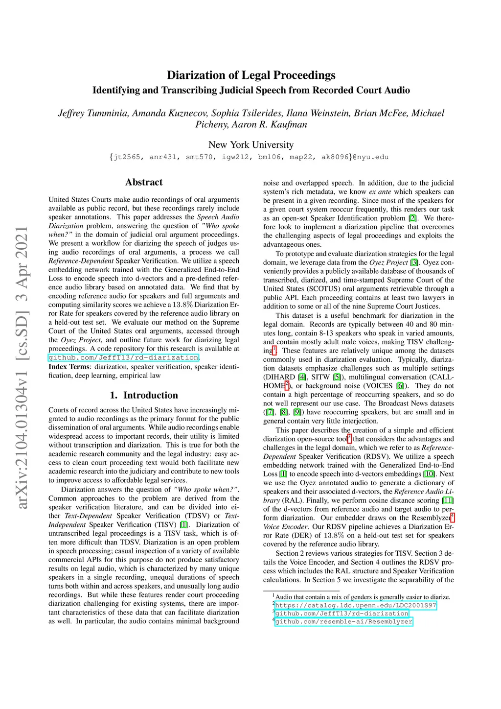 United States Courts make audio recordings of oral arguments available as public record, but these recordings rarely include speaker annotations. This paper addresses the Speech Audio Diarization problem, answering the question of "Who spoke when?" in the domain of judicial oral argument proceedings. We present a workflow for diarizing the speech of judges using audio recordings of oral arguments, a process we call Reference-Dependent Speaker Verification. We utilize a speech embedding network trained with the Generalized End-to-End Loss to encode speech into d-vectors and a pre-defined reference audio library based on annotated data. We find that by encoding reference audio for speakers and full arguments and computing similarity scores we achieve a 13.8% Diarization Error Rate for speakers covered by the reference audio library on a held-out test set. We evaluate our method on the Supreme Court of the United States oral arguments, accessed through the Oyez Project, and outline future work for diarizing legal proceedings. A code repository for this research is available at github.com/JeffT13/rd-diarization