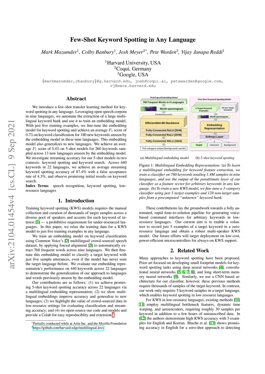 We introduce a few-shot transfer learning method for keyword spotting in any language. Leveraging open speech corpora in nine languages, we automate the extraction of a large multilingual keyword bank and use it to train an embedding model. With just five training examples, we fine-tune the embedding model for keyword spotting and achieve an average F1 score of 0.75 on keyword classification for 180 new keywords unseen by the embedding model in these nine languages. This embedding model also generalizes to new languages. We achieve an average F1 score of 0.65 on 5-shot models for 260 keywords sampled across 13 new languages unseen by the embedding model. We investigate streaming accuracy for our 5-shot models in two contexts: keyword spotting and keyword search. Across 440 keywords in 22 languages, we achieve an average streaming keyword spotting accuracy of 87.4% with a false acceptance rate of 4.3%, and observe promising initial results on keyword search.