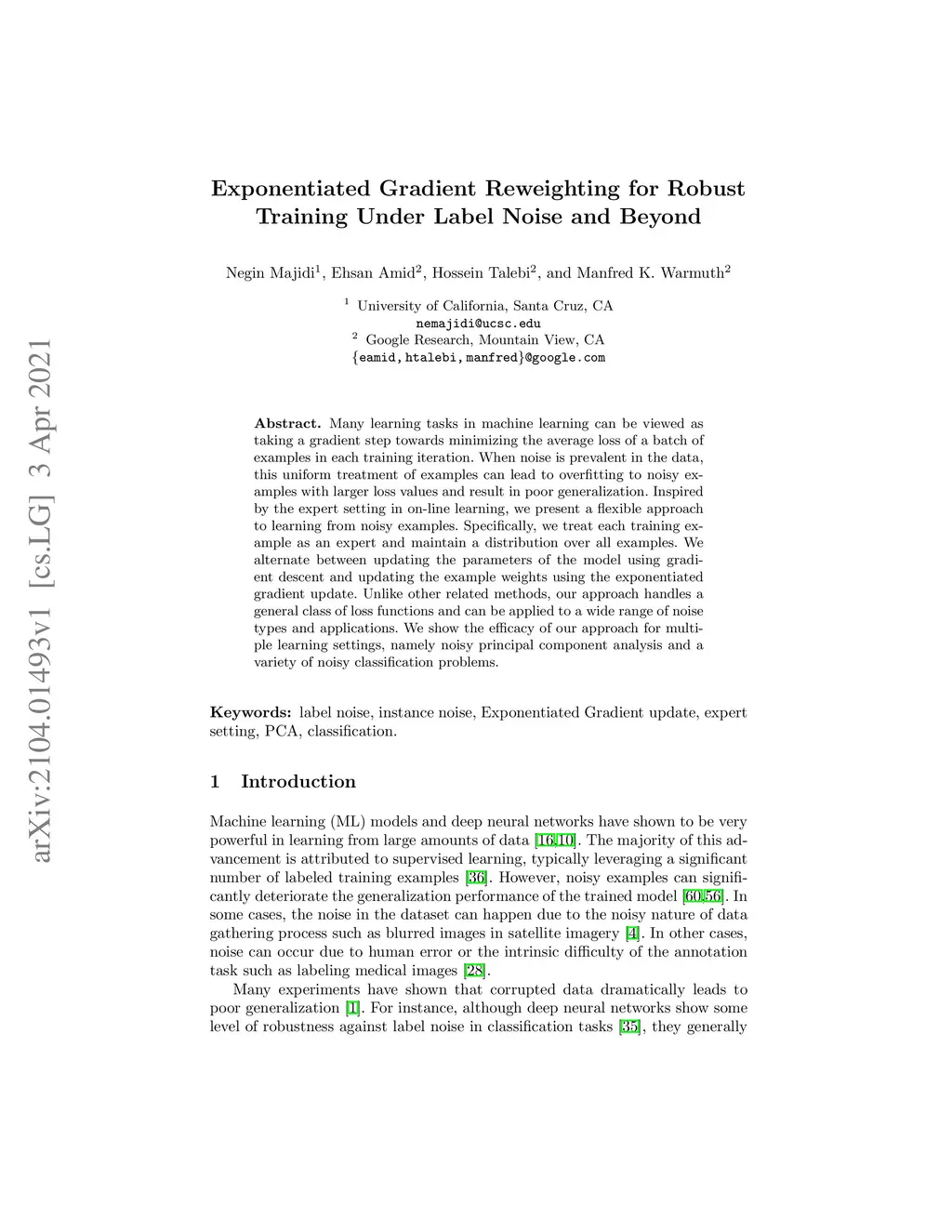 Many learning tasks in machine learning can be viewed as taking a gradient step towards minimizing the average loss of a batch of examples in each training iteration. When noise is prevalent in the data, this uniform treatment of examples can lead to overfitting to noisy examples with larger loss values and result in poor generalization. Inspired by the expert setting in on-line learning, we present a flexible approach to learning from noisy examples. Specifically, we treat each training example as an expert and maintain a distribution over all examples. We alternate between updating the parameters of the model using gradient descent and updating the example weights using the exponentiated gradient update. Unlike other related methods, our approach handles a general class of loss functions and can be applied to a wide range of noise types and applications. We show the efficacy of our approach for multiple learning settings, namely noisy principal component analysis and a variety of noisy classification problems.