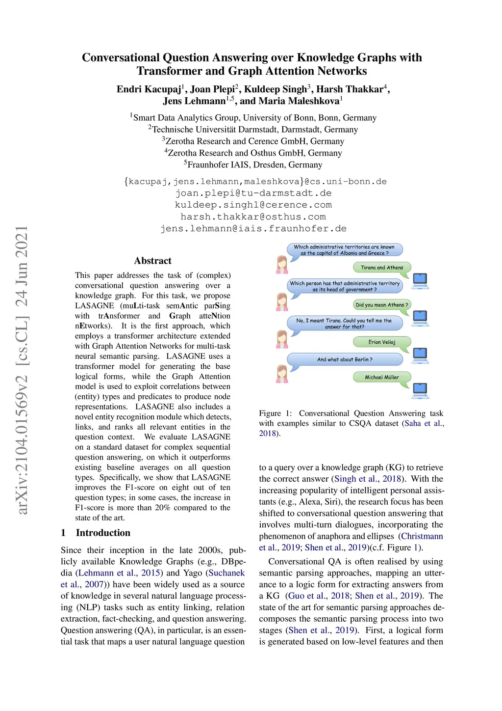 This paper addresses the task of (complex) conversational question answering over a knowledge graph. For this task, we propose LASAGNE (muLti-task semAntic parSing with trAnsformer and Graph atteNtion nEtworks). It is the first approach, which employs a transformer architecture extended with Graph Attention Networks for multi-task neural semantic parsing. LASAGNE uses a transformer model for generating the base logical forms, while the Graph Attention model is used to exploit correlations between (entity) types and predicates to produce node representations. LASAGNE also includes a novel entity recognition module which detects, links, and ranks all relevant entities in the question context. We evaluate LASAGNE on a standard dataset for complex sequential question answering, on which it outperforms existing baseline averages on all question types. Specifically, we show that LASAGNE improves the F1-score on eight out of ten question types; in some cases, the increase in F1-score is more than 20% compared to the state of the art.