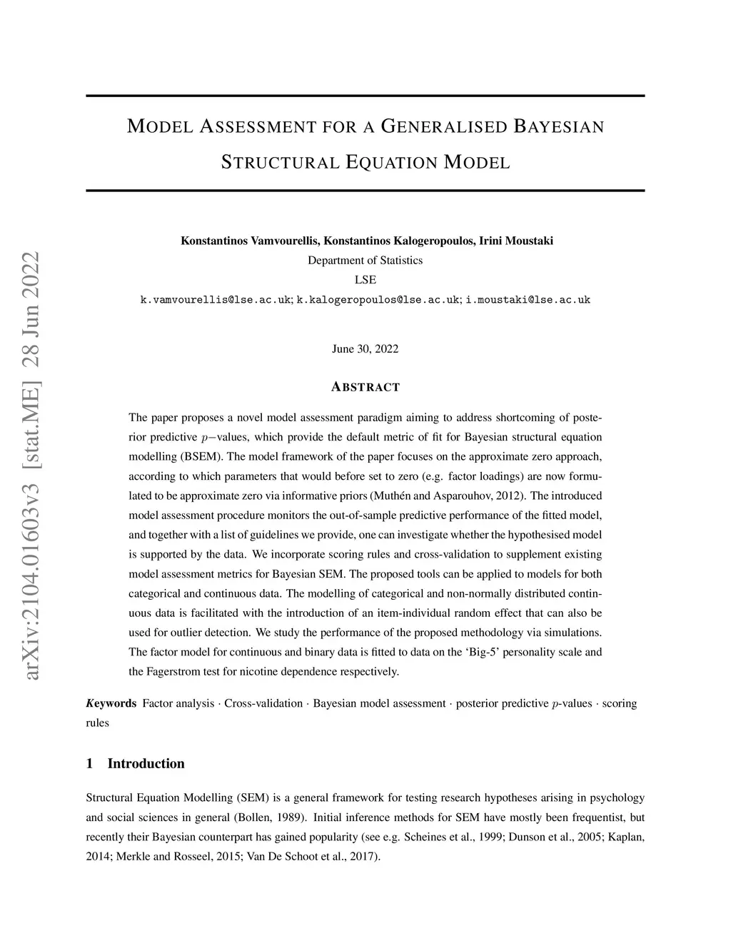 The paper proposes a novel model assessment paradigm aiming to address shortcoming of posterior predictive values, which provide the default metric of fit for Bayesian structural equation modelling (BSEM). The model framework of the paper focuses on the approximate zero approach, according to which parameters that would before set to zero (e.g. factor loadings) are now formulated to be approximate zero via informative priors (Muthen and Asparouhov, 2012). The introduced model assessment procedure monitors the out-of-sample predictive performance of the fitted model, and together with a list of guidelines we provide, one can investigate whether the hypothesised model is supported by the data. We incorporate scoring rules and cross-validation to supplement existing model assessment metrics for Bayesian SEM. The proposed tools can be applied to models for both categorical and continuous data. The modelling of categorical and non-normally distributed continuous data is facilitated with the introduction of an item-individual random effect that can also be used for outlier detection. We study the performance of the proposed methodology via simulations. The factor model for continuous and binary data is fitted to data on the `Big-5' personality scale and the Fagerstrom test for nicotine dependence respectively.