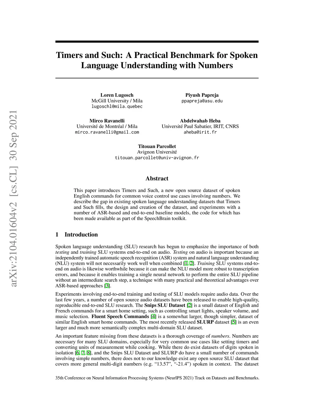 This paper introduces Timers and Such, a new open source dataset of spoken English commands for common voice control use cases involving numbers. We describe the gap in existing spoken language understanding datasets that Timers and Such fills, the design and creation of the dataset, and experiments with a number of ASR-based and end-to-end baseline models, the code for which has been made available as part of the SpeechBrain toolkit.