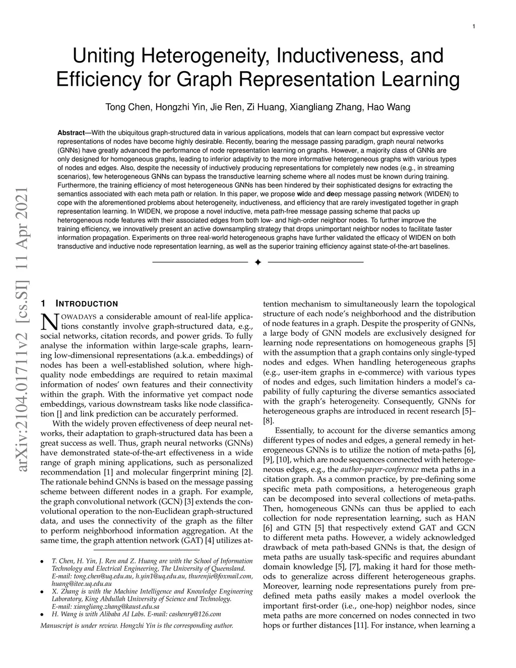 With the ubiquitous graph-structured data in various applications, models that can learn compact but expressive vector representations of nodes have become highly desirable. Recently, bearing the message passing paradigm, graph neural networks (GNNs) have greatly advanced the performance of node representation learning on graphs. However, a majority class of GNNs are only designed for homogeneous graphs, leading to inferior adaptivity to the more informative heterogeneous graphs with various types of nodes and edges. Also, despite the necessity of inductively producing representations for completely new nodes (e.g., in streaming scenarios), few heterogeneous GNNs can bypass the transductive learning scheme where all nodes must be known during training. Furthermore, the training efficiency of most heterogeneous GNNs has been hindered by their sophisticated designs for extracting the semantics associated with each meta path or relation. In this paper, we propose WIde and DEep message passing Network (WIDEN) to cope with the aforementioned problems about heterogeneity, inductiveness, and efficiency that are rarely investigated together in graph representation learning. In WIDEN, we propose a novel inductive, meta path-free message passing scheme that packs up heterogeneous node features with their associated edges from both low- and high-order neighbor nodes. To further improve the training efficiency, we innovatively present an active downsampling strategy that drops unimportant neighbor nodes to facilitate faster information propagation. Experiments on three real-world heterogeneous graphs have further validated the efficacy of WIDEN on both transductive and inductive node representation learning, as well as the superior training efficiency against state-of-the-art baselines.