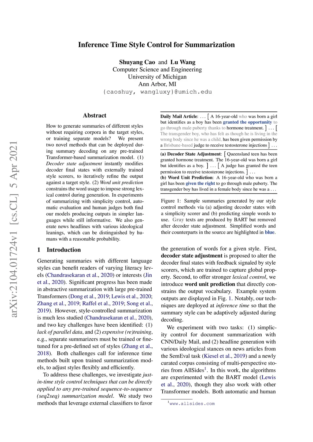 How to generate summaries of different styles without requiring corpora in the target styles, or training separate models? We present two novel methods that can be deployed during summary decoding on any pre-trained Transformer-based summarization model. (1) Decoder state adjustment instantly modifies decoder final states with externally trained style scorers, to iteratively refine the output against a target style. (2) Word unit prediction constrains the word usage to impose strong lexical control during generation. In experiments of summarizing with simplicity control, automatic evaluation and human judges both find our models producing outputs in simpler languages while still informative. We also generate news headlines with various ideological leanings, which can be distinguished by humans with a reasonable probability.