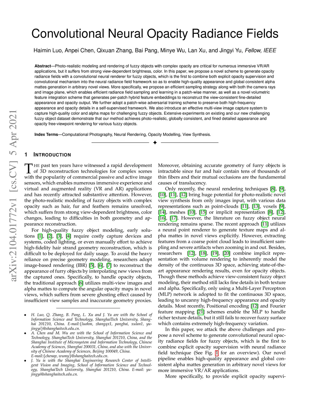 Photo-realistic modeling and rendering of fuzzy objects with complex opacity are critical for numerous immersive VR/AR applications, but it suffers from strong view-dependent brightness, color. In this paper, we propose a novel scheme to generate opacity radiance fields with a convolutional neural renderer for fuzzy objects, which is the first to combine both explicit opacity supervision and convolutional mechanism into the neural radiance field framework so as to enable high-quality appearance and global consistent alpha mattes generation in arbitrary novel views. More specifically, we propose an efficient sampling strategy along with both the camera rays and image plane, which enables efficient radiance field sampling and learning in a patch-wise manner, as well as a novel volumetric feature integration scheme that generates per-patch hybrid feature embeddings to reconstruct the view-consistent fine-detailed appearance and opacity output. We further adopt a patch-wise adversarial training scheme to preserve both high-frequency appearance and opacity details in a self-supervised framework. We also introduce an effective multi-view image capture system to capture high-quality color and alpha maps for challenging fuzzy objects. Extensive experiments on existing and our new challenging fuzzy object dataset demonstrate that our method achieves photo-realistic, globally consistent, and fined detailed appearance and opacity free-viewpoint rendering for various fuzzy objects.