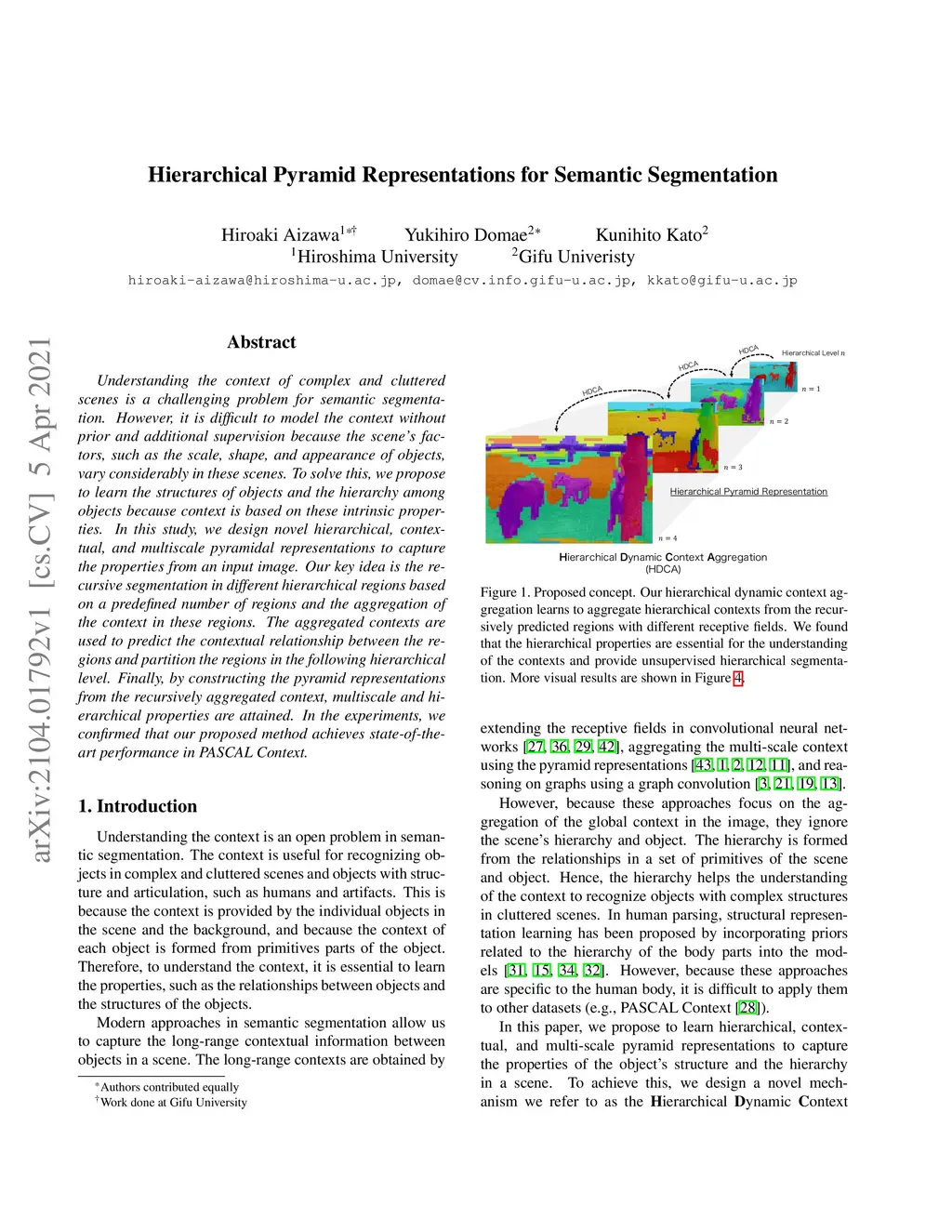 Understanding the context of complex and cluttered scenes is a challenging problem for semantic segmentation. However, it is difficult to model the context without prior and additional supervision because the scene's factors, such as the scale, shape, and appearance of objects, vary considerably in these scenes. To solve this, we propose to learn the structures of objects and the hierarchy among objects because context is based on these intrinsic properties. In this study, we design novel hierarchical, contextual, and multiscale pyramidal representations to capture the properties from an input image. Our key idea is the recursive segmentation in different hierarchical regions based on a predefined number of regions and the aggregation of the context in these regions. The aggregated contexts are used to predict the contextual relationship between the regions and partition the regions in the following hierarchical level. Finally, by constructing the pyramid representations from the recursively aggregated context, multiscale and hierarchical properties are attained. In the experiments, we confirmed that our proposed method achieves state-of-the-art performance in PASCAL Context.