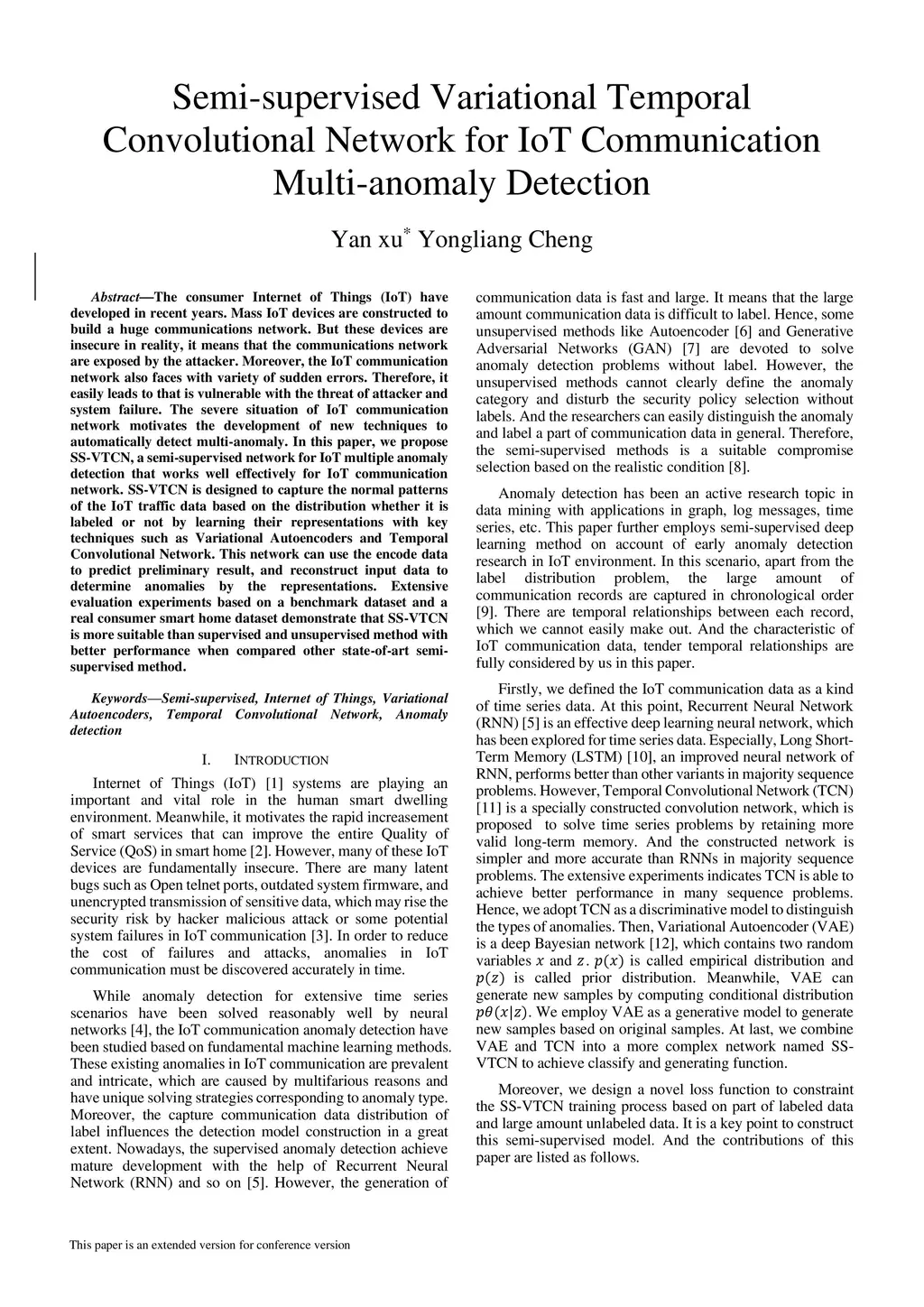 The consumer Internet of Things (IoT) have developed in recent years. Mass IoT devices are constructed to build a huge communications network. But these devices are insecure in reality, it means that the communications network are exposed by the attacker. Moreover, the IoT communication network also faces with variety of sudden errors. Therefore, it easily leads to that is vulnerable with the threat of attacker and system failure. The severe situation of IoT communication network motivates the development of new techniques to automatically detect multi-anomaly. In this paper, we propose SS-VTCN, a semi-supervised network for IoT multiple anomaly detection that works well effectively for IoT communication network. SS-VTCN is designed to capture the normal patterns of the IoT traffic data based on the distribution whether it is labeled or not by learning their representations with key techniques such as Variational Autoencoders and Temporal Convolutional Network. This network can use the encode data to predict preliminary result, and reconstruct input data to determine anomalies by the representations. Extensive evaluation experiments based on a benchmark dataset and a real consumer smart home dataset demonstrate that SS-VTCN is more suitable than supervised and unsupervised method with better performance when compared other state-of-art semi-supervised method.