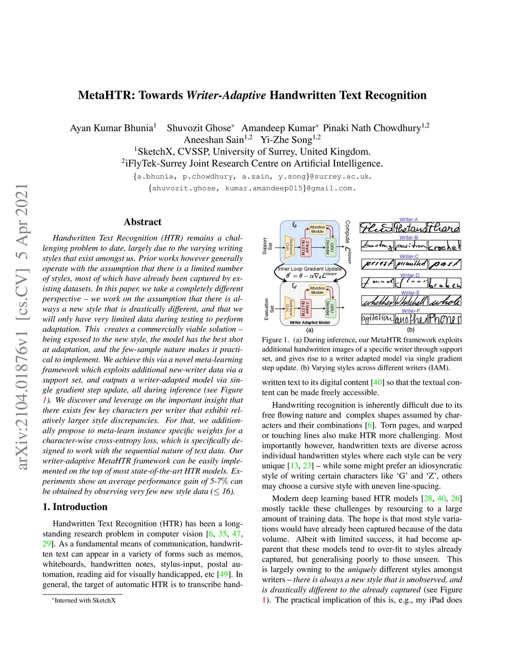 Handwritten Text Recognition (HTR) remains a challenging problem to date, largely due to the varying writing styles that exist amongst us. Prior works however generally operate with the assumption that there is a limited number of styles, most of which have already been captured by existing datasets. In this paper, we take a completely different perspective -- we work on the assumption that there is always a new style that is drastically different, and that we will only have very limited data during testing to perform adaptation. This results in a commercially viable solution -- the model has the best shot at adaptation being exposed to the new style, and the few samples nature makes it practical to implement. We achieve this via a novel meta-learning framework which exploits additional new-writer data through a support set, and outputs a writer-adapted model via single gradient step update, all during inference. We discover and leverage on the important insight that there exists few key characters per writer that exhibit relatively larger style discrepancies. For that, we additionally propose to meta-learn instance specific weights for a character-wise cross-entropy loss, which is specifically designed to work with the sequential nature of text data. Our writer-adaptive MetaHTR framework can be easily implemented on the top of most state-of-the-art HTR models. Experiments show an average performance gain of 5-7% can be obtained by observing very few new style data. We further demonstrate via a set of ablative studies the advantage of our meta design when compared with alternative adaption mechanisms.