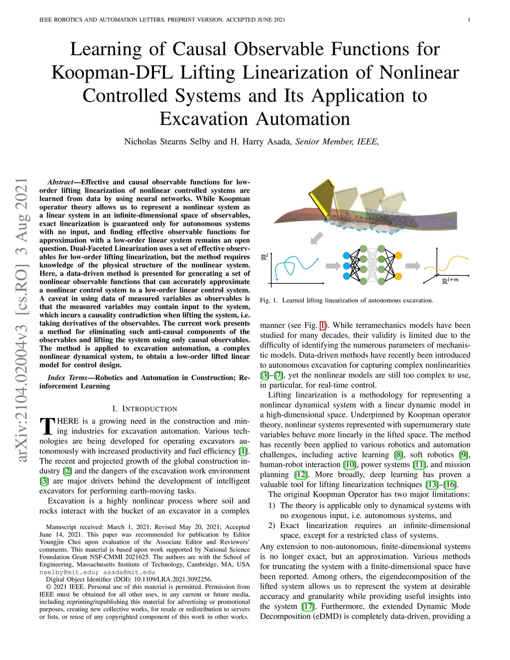 Effective and causal observable functions for low-order lifting linearization of nonlinear controlled systems are learned from data by using neural networks. While Koopman operator theory allows us to represent a nonlinear system as a linear system in an infinite-dimensional space of observables, exact linearization is guaranteed only for autonomous systems with no input, and finding effective observable functions for approximation with a low-order linear system remains an open question. Dual-Faceted Linearization uses a set of effective observables for low-order lifting linearization, but the method requires knowledge of the physical structure of the nonlinear system. Here, a data-driven method is presented for generating a set of nonlinear observable functions that can accurately approximate a nonlinear control system to a low-order linear control system. A caveat in using data of measured variables as observables is that the measured variables may contain input to the system, which incurs a causality contradiction when lifting the system, i.e. taking derivatives of the observables. The current work presents a method for eliminating such anti-causal components of the observables and lifting the system using only causal observables. The method is applied to excavation automation, a complex nonlinear dynamical system, to obtain a low-order lifted linear model for control design.