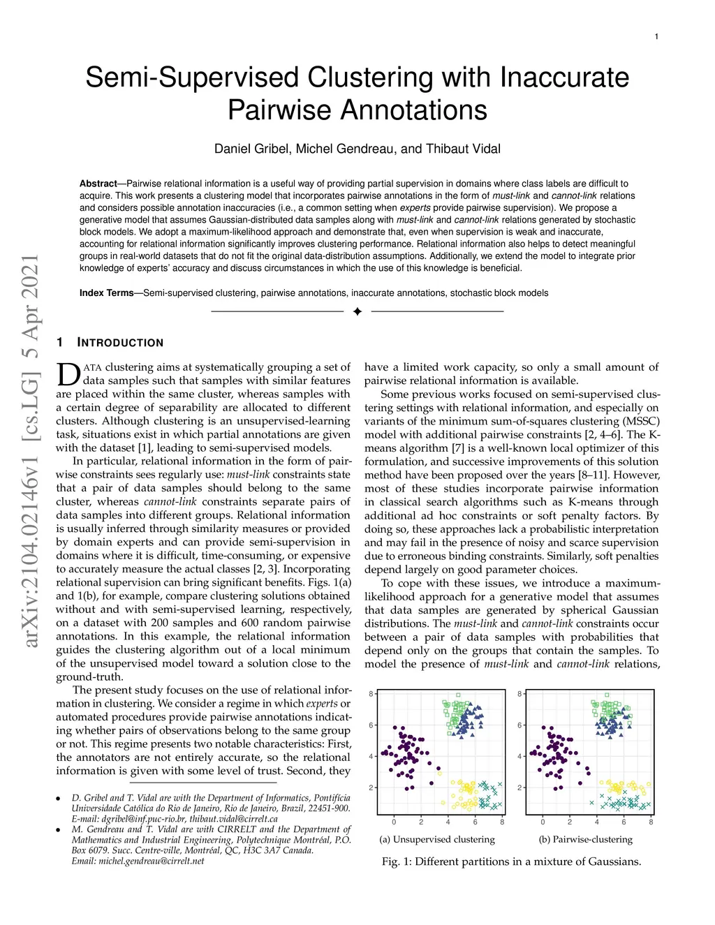 Pairwise relational information is a useful way of providing partial supervision in domains where class labels are difficult to acquire. This work presents a clustering model that incorporates pairwise annotations in the form of must-link and cannot-link relations and considers possible annotation inaccuracies (i.e., a common setting when experts provide pairwise supervision). We propose a generative model that assumes Gaussian-distributed data samples along with must-link and cannot-link relations generated by stochastic block models. We adopt a maximum-likelihood approach and demonstrate that, even when supervision is weak and inaccurate, accounting for relational information significantly improves clustering performance. Relational information also helps to detect meaningful groups in real-world datasets that do not fit the original data-distribution assumptions. Additionally, we extend the model to integrate prior knowledge of experts' accuracy and discuss circumstances in which the use of this knowledge is beneficial.